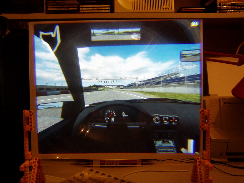 Discovery #4, not good: the picture is a bit blurry. Colours "leak" a bit, and the picture is not as shar as without the lens. Reduce the distance between the lens and monitor to reduce magnifying factor and also draw back from the lens, to reduce the angles of refraction. So, again a trade-off: FOV vs sharpness.