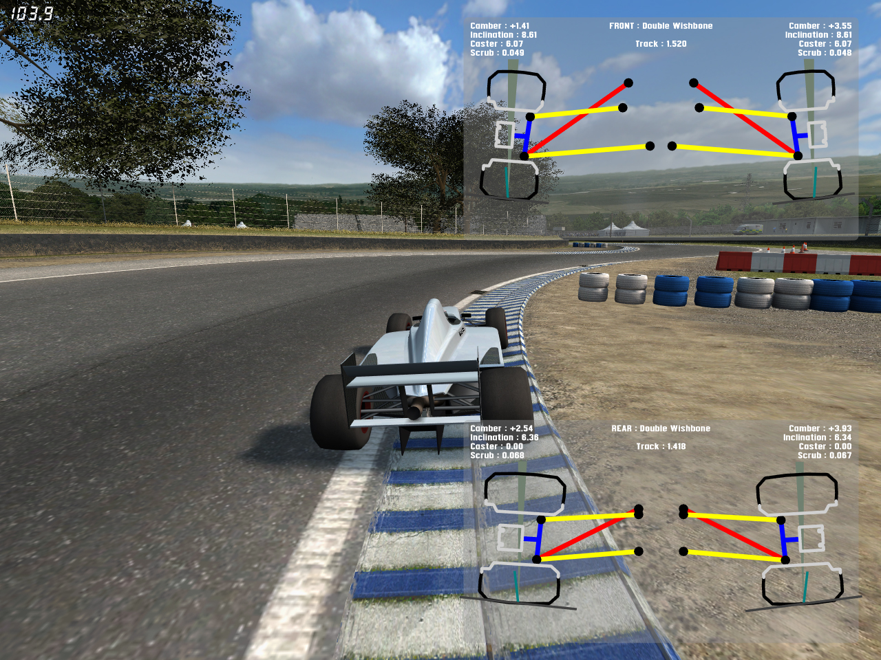 Camber adjustments for skidpad tests were done with the Shift-L suspension display on. This shows camber while actually cornering. What's noticeable is that the peak lateral grip comes in when camber is 0 on the Shift-L display. I.e., when camber is actually 0 at the moment relative to the road. This is what I call "dynamic camber" rather than the camber shown in the setup screens for "live camber," which to me is just "camber." In the setup screen this means adding in a lot of camber adjustment because the suspension geometry on all the cars I've tried lack enough camber gain to handle this (they all need shorter upper arms, pretty much).