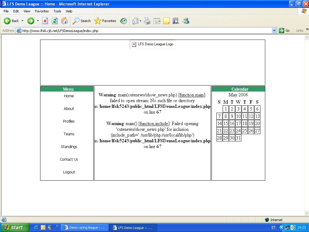 Warning: main() [[URL="http://www.lfskl.cjb.net/LFSDemoLeague/function.include"]function.include[/URL]]: Failed opening 'cutenews/show_news.php' for inclusion (include_path='.:/usr/lib/php:/usr/local/lib/php') in /home/lfsk5243/public_html/LFSDemoLeague/index.php on line 67"
