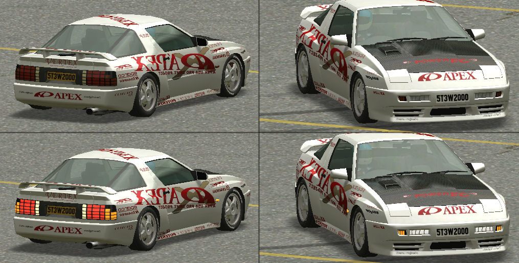 lol. The delorian lights look like windows media player's bars visualisation. Well they remind me of it anyway. Nice concept. maybe if you make a skin with the delorian's front lights you'll be able to go back to the future! Well my backlights are pretty snazzy. off a D1 FC RX-7. I didn't make em but i'm sure as hell not about to change em. they look briliant. May post a screenie later.