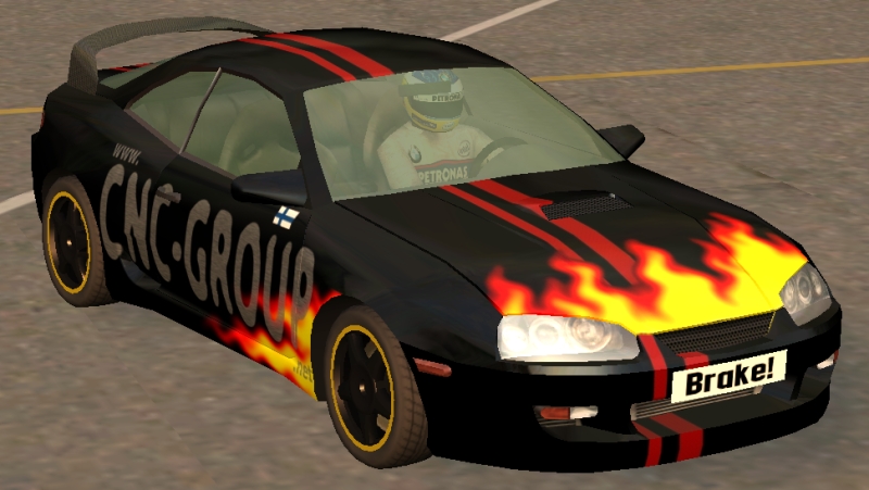I like the flame but it needs to be extended round the front sides and onto the front wings. The red stripe is lost on the design, y9ou should scrap it and concentrate on using the flame design to envelope the whole front end of the car.