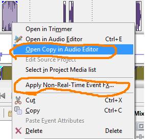 I usually use the "open copy in audio editor". My default editor is sound recorder so I just increase speed by 100%, save, and Vegas does it for me. It saves the file as "<Name> Take 2.wav and automatically puts it in the right place, in the right group. Or "apply non real time even FX". See attachment.