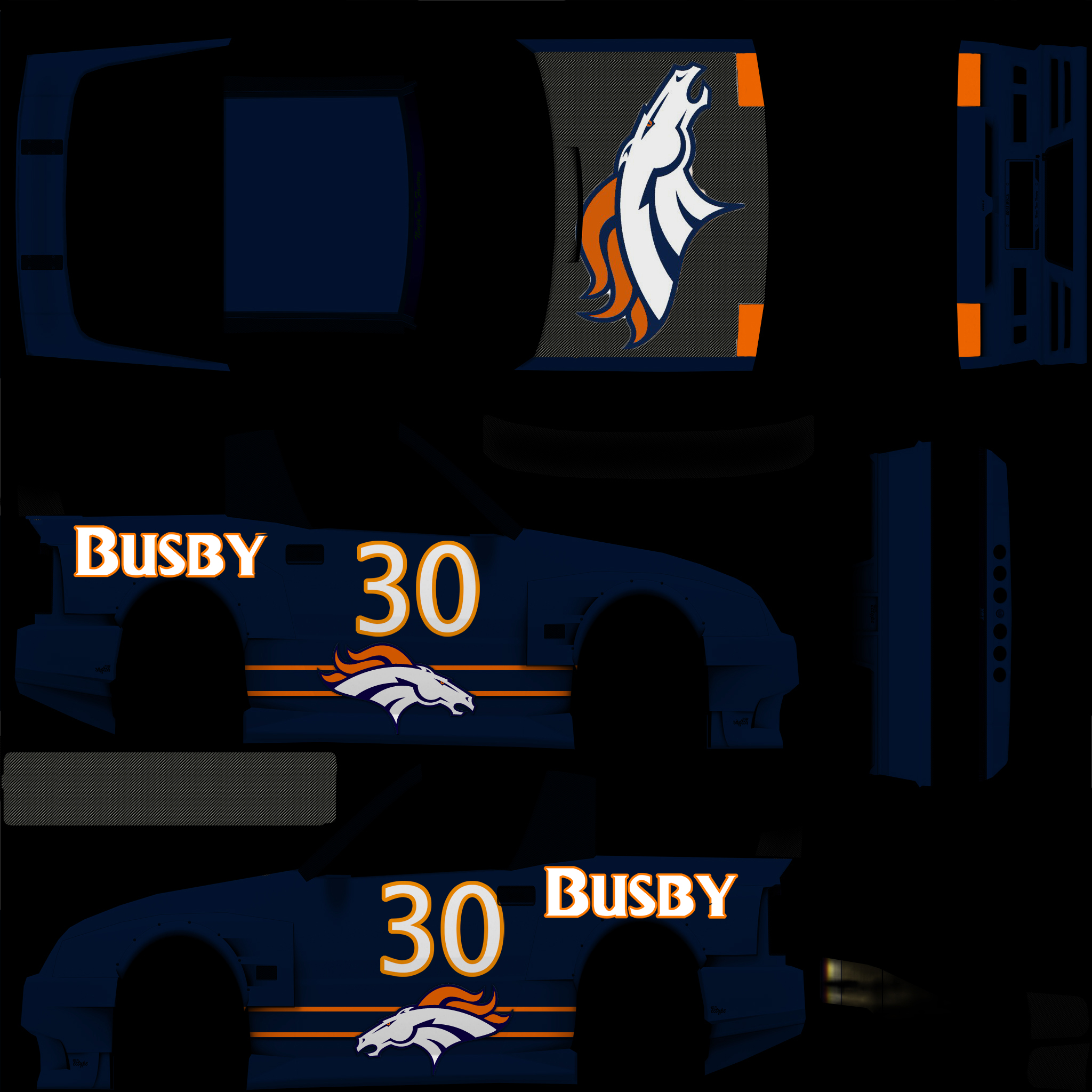 with the name busby on it and with a big number 30 on the side in broncos colors and the bronco horse on the hood please. with the ectype body kit on it please
