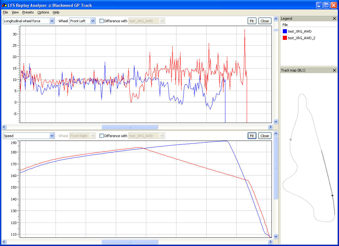Here are two RAF files of the XRG at Blackwood. The screenie shows them in LRA, zoomed in at the main straight. In both, the longitudinal wheel force is above zero. In the second file (red line in graph), I lifted the throttle near the end of the straight. You can see that the force is a bit higher when the car is coasting.