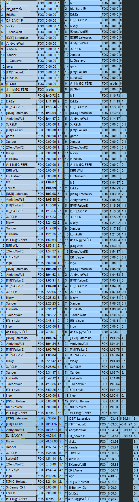 - Also, for the option "Laptimes (L)" it would be nice to see all laptimes, instead of the difference between the drivers.