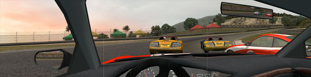 I'm not on expert on this, so bear with me. Current sim setups use 3 monitors (triple-head-to-go or multiple video cards) or a large projection screen. Most 3 monitor setups I've seen have the left and right monitors angled in at the user (which is wrong because they're acting as one large widescreen display). In order to get a sense of speed and also to see the side mirrors, we must set a high FOV which makes this single viewport distorted.