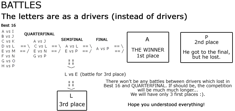 In Best 16 will be drivers sorted by a points which they received in qualification. The driver with the highest score will in 1st battle vs. the driver with the lowest score. 1st vs 16th, 2nd vs 15th, 3rd vs 14th etc. This is the system. The bests versus the worst. This system will get to the final battle the best drivers.