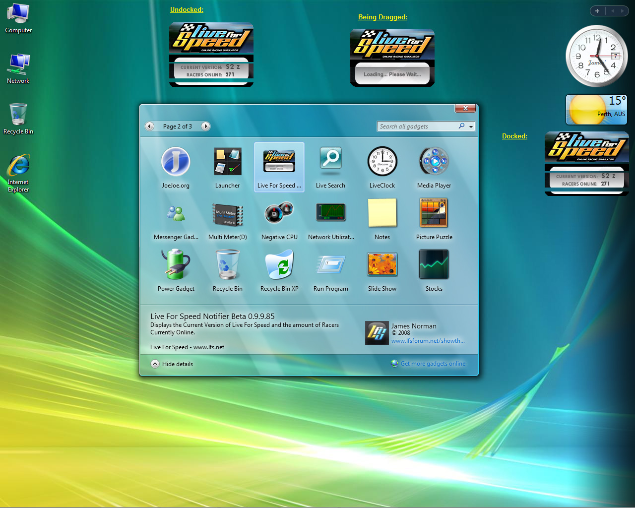 The "Live For Speed Windows Gadget" and "Live For Speed Google Gadget" displays the Current Version of Live For Speed and the amount of Players Currently Online.