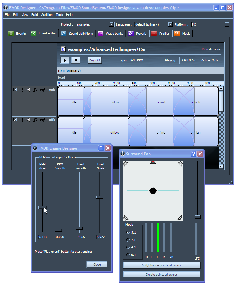 First, I learned the basics about sample based systems... cross-fading loop based samples, changing the volume/pitch, etc. Then I downloaded this neat tool called FMOD Designer. It's free to download here:
