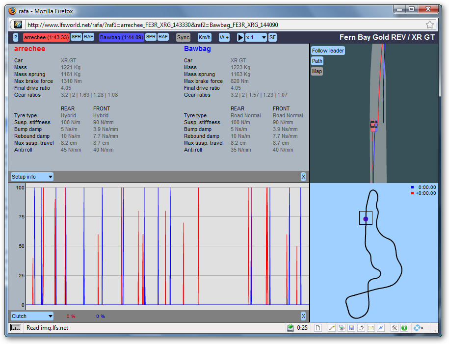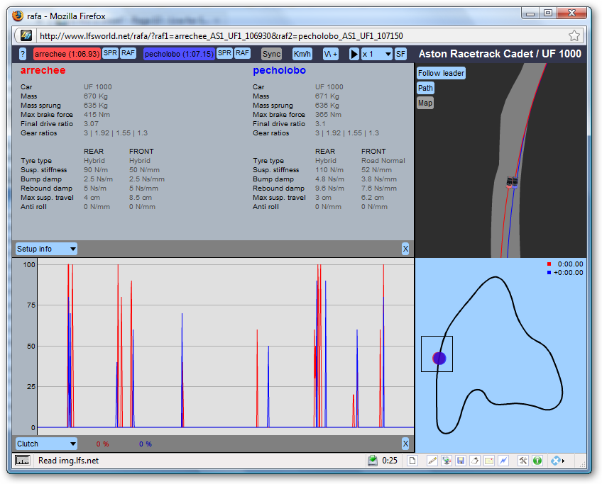 But I think it's pretty certain that Pecholobo was using it, so I compared their hotlaps on AS1/UF1. If someone is using autoclutch, the graph would be at 100 on each shift. Here they are mostly faster than that.