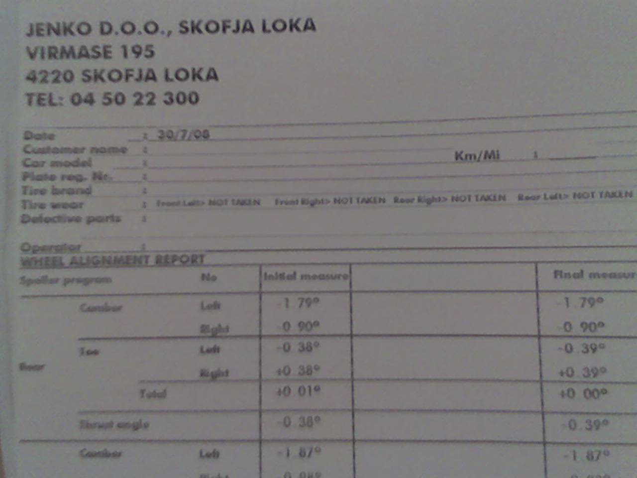 I had my car checked for wheel alignment and this is report. Can anyone comment on that, cause it looks strange to me. I kind of expected more symmetric stuff, and toe a bit positive on both front wheels ? And initial measure is almost exactly same as final. Does that mean they didn't fix anything or they just measured twice the same thing lol. Pic is crappy (phone cam ftl), but numbers can be read