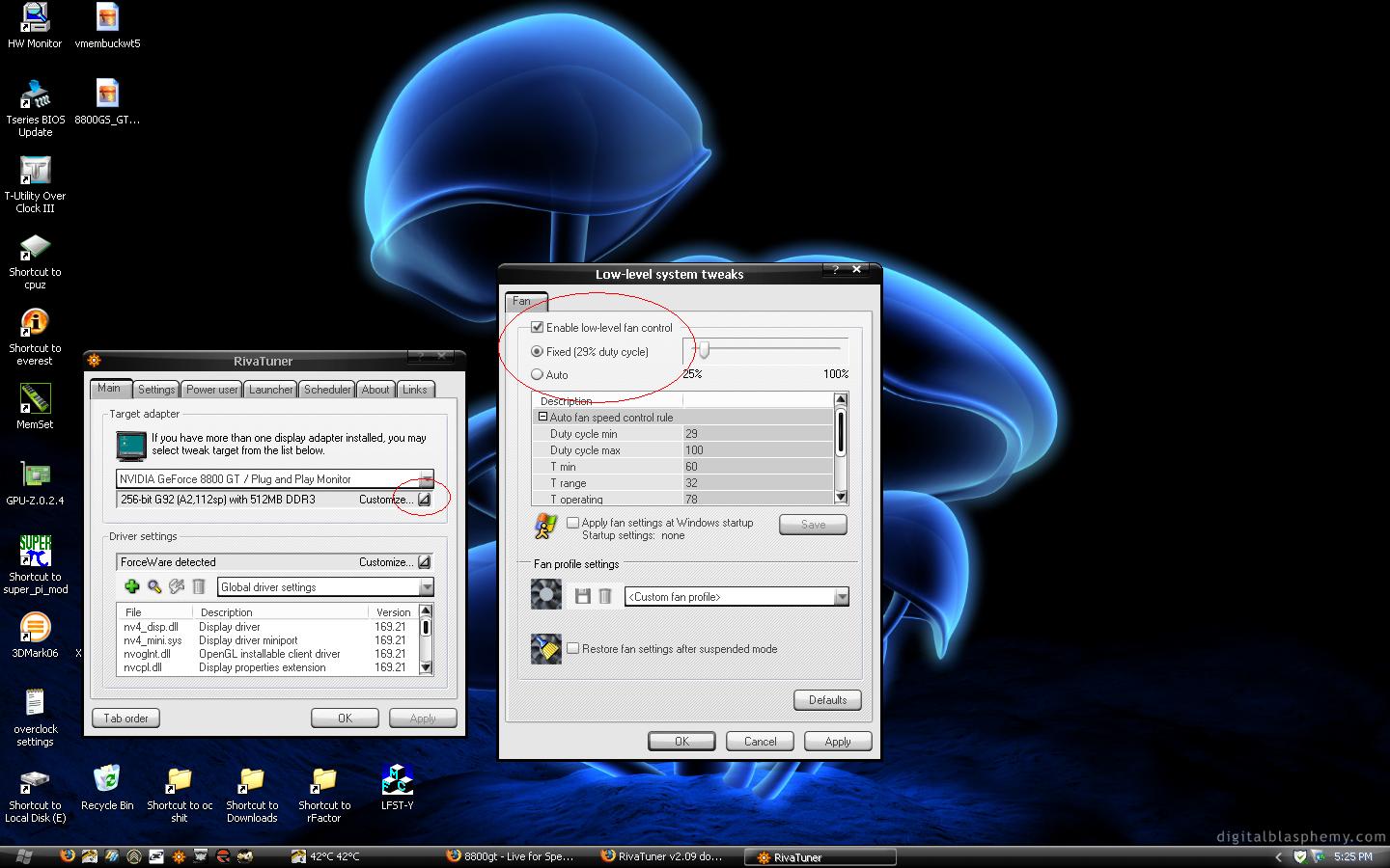 While looking on forums to increase my fan speed for the graphics card it turns out the standard speed of the fan is running at around 20%. If you use a program such as Rivatuner you can change it to run at 50% fan speed which drastically decreases the temperature it runs at