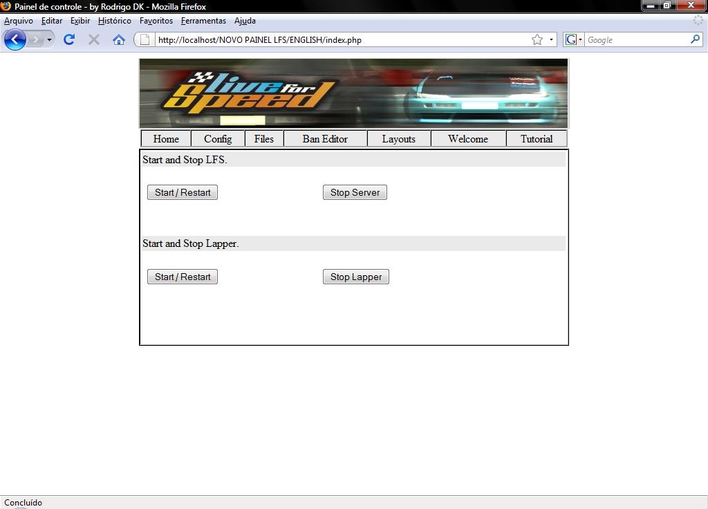 To run the panel it is enough to open the archive that if finds in the folder "start_stop\data\configuration.php" e finds the line defines ("_DIRECTORY"," C:\\wamp\\www\\archives\\"); and add the directory where it is the executable LFS.exe so that the STAR/STOP functions correctly.