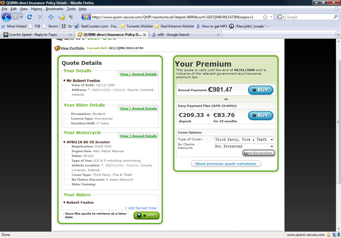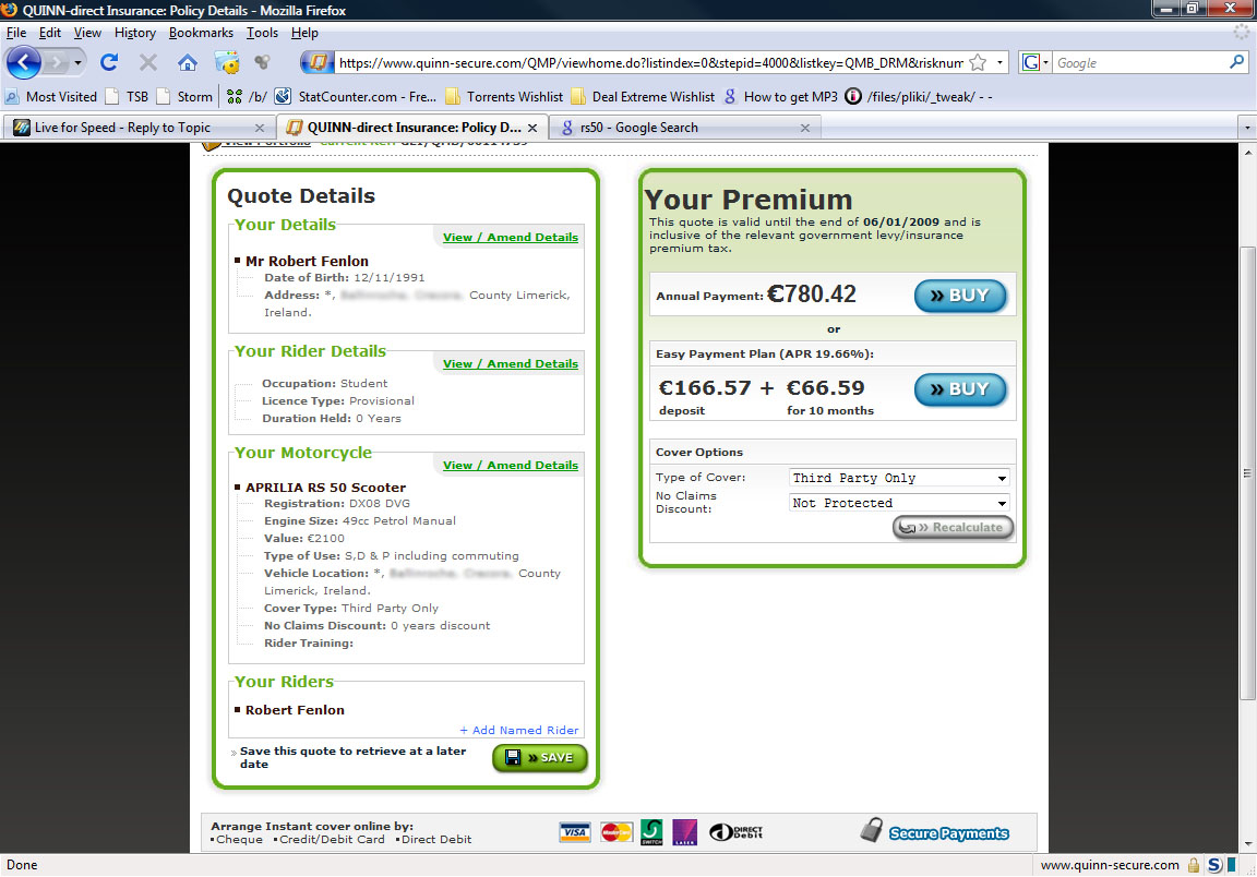 Actually, for the lulz, I just got a quote from Quinn, a big Irish insurer, for a standard RS50 (Nabbed the reg and price from the first Ebay listing of an RS50 I saw). Quotes attached Not as bad as before, but maybe the 50cc and an extra year helps