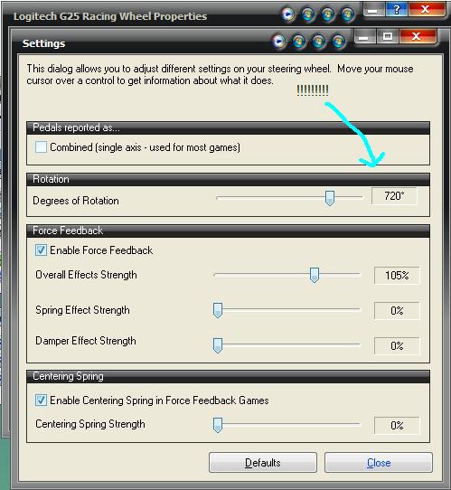 In-game i install my wheel at 720 degress (lock to lock) , i also install that in the game software, Logitech Wingman Profiler.