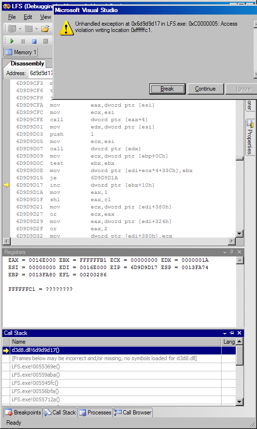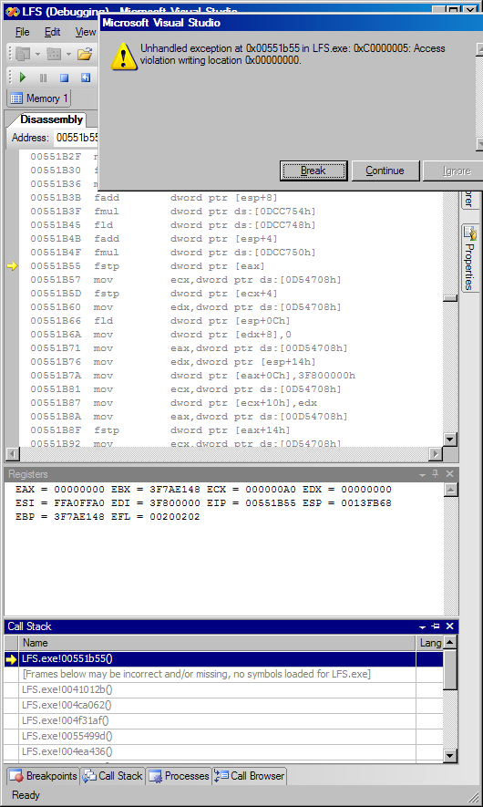 At least the crash address is inside the LFS module in this case so I have a clue where to start looking, but it would be a lot easier if I could catch it in the debugger.