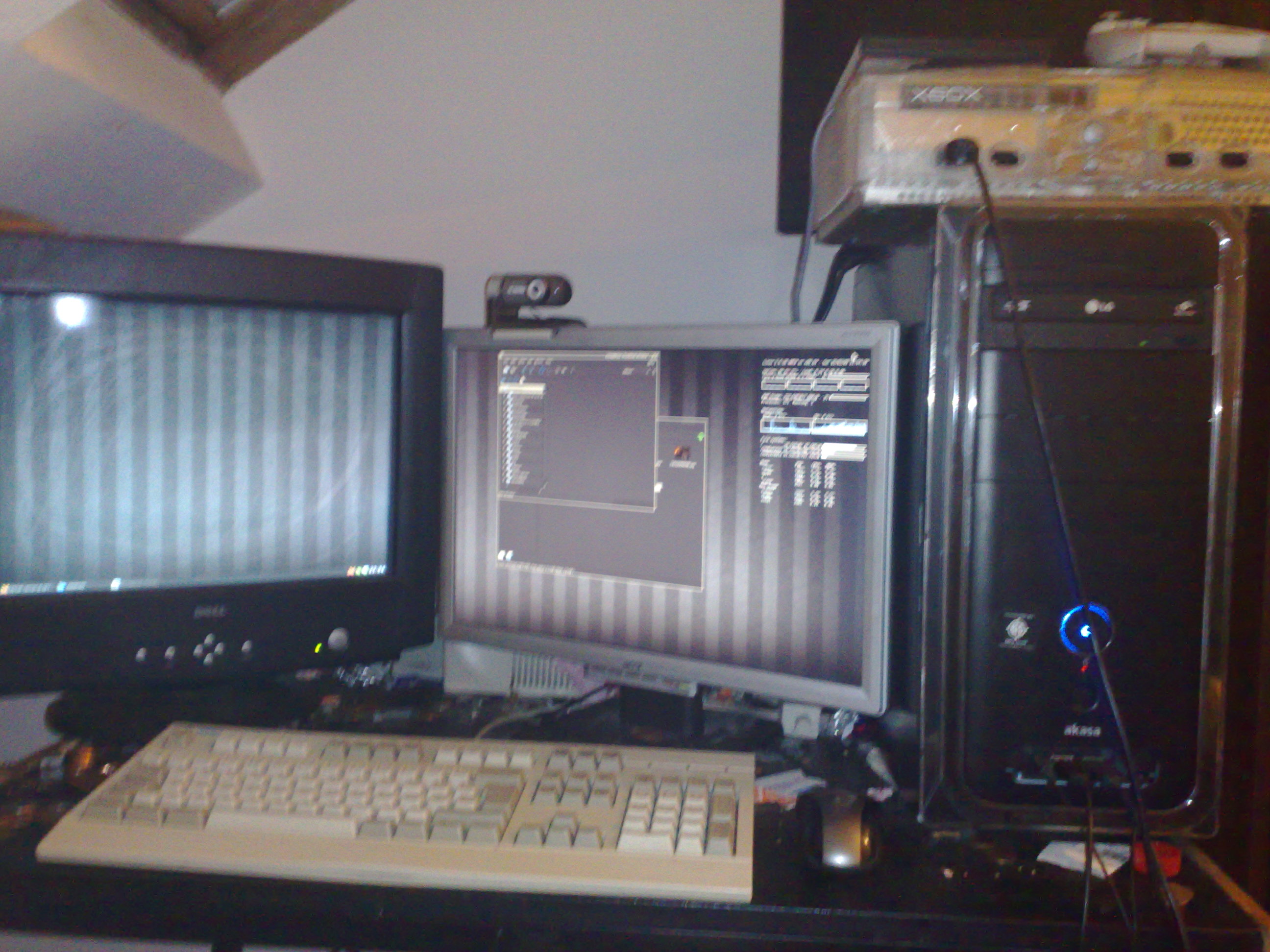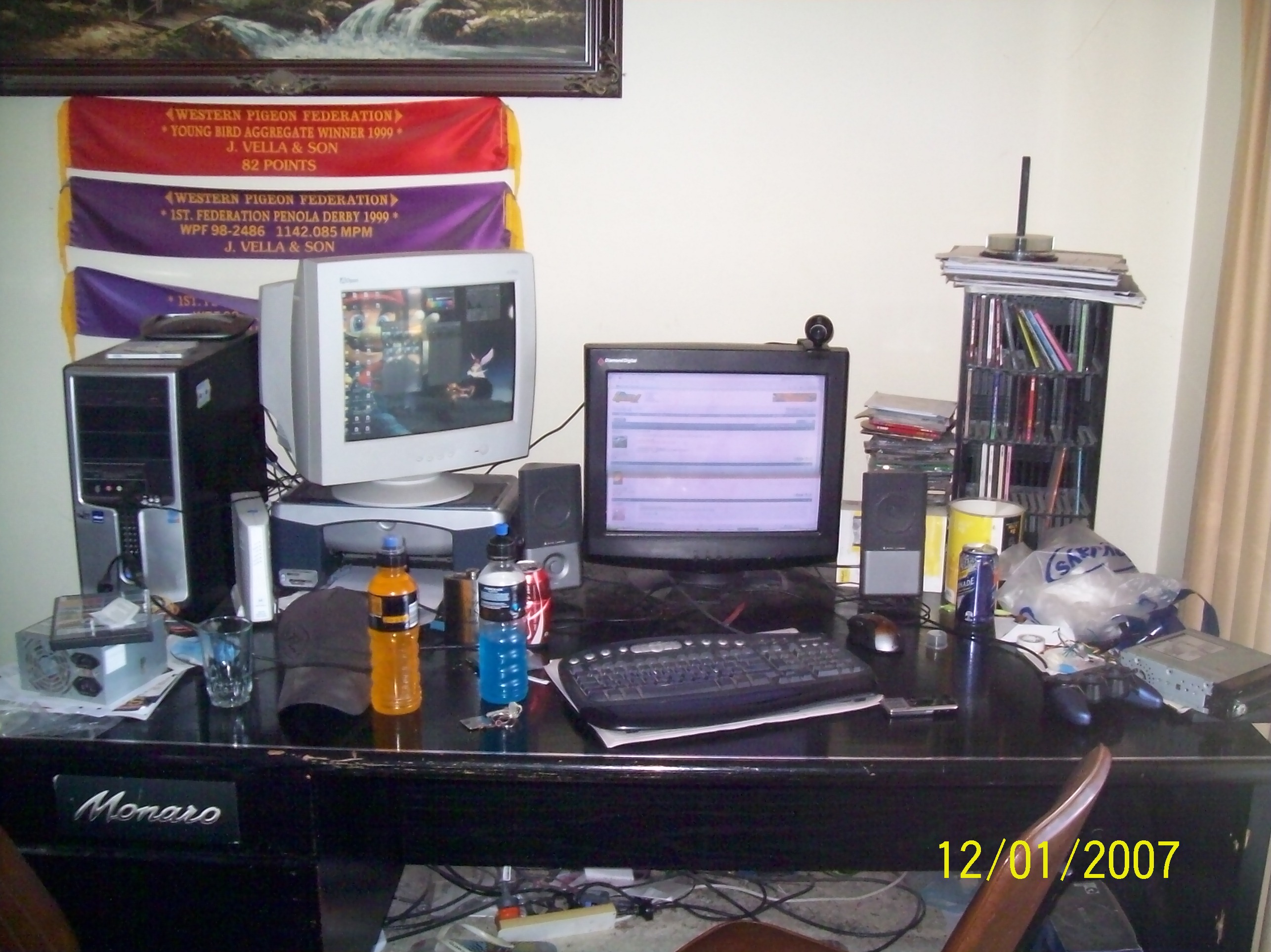 this is my desk. messy, coke cans, lemonade cans, the powerade bottltles im drinkin atm. my controller cauz im yet to get a wheel. power supply thats blown up on the left, my in car dvd thats blown up oon the right. my 2 "old school" monitors, dont have the oney for flat panels, they do the job anywayz.