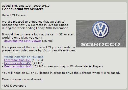 On Vw's side, it's a good marketing strategy as well, not for the LFS customers only (it is advertising for free, and among the 22k licensed users, there may be a couple hundreds that are potential customers, who can have a global idea of how the car behaves) but also for the brand's image: they are not afraid to submit their car to testing on the most unforgiving driving simulator ever built, and need not hide behind arcadish titles like the NFS series with a ton of conditions saying "You must make it perform super duper good so that it is attractive to people.