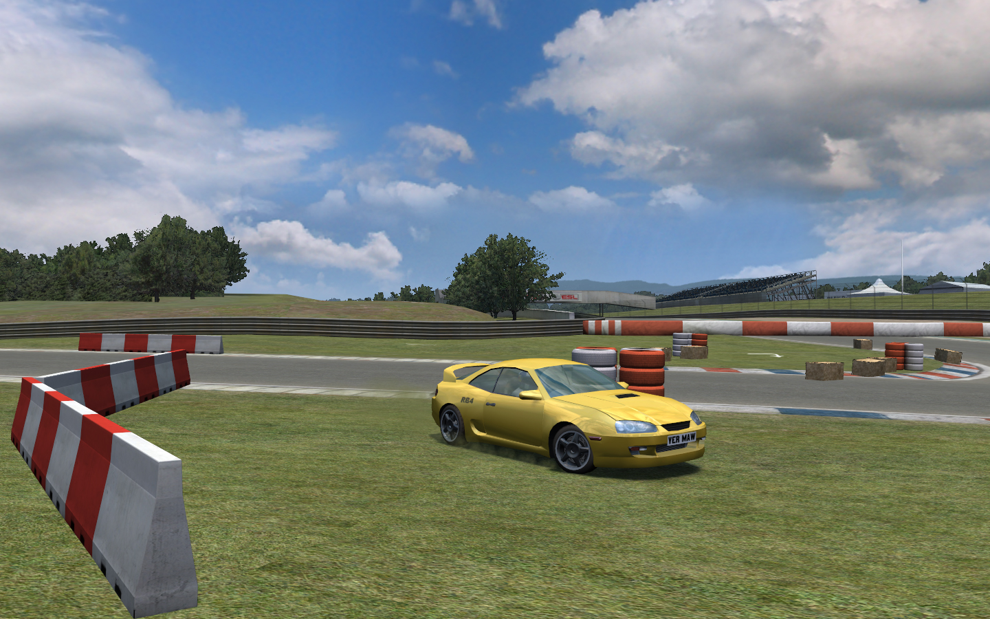 Into the pits - obey the speed limit - and then back across the gravel jumps, go to the left of the starting blocks, stay on the grass until the markers finish and then handbrakes turn to finish at the Aston North hairpin.