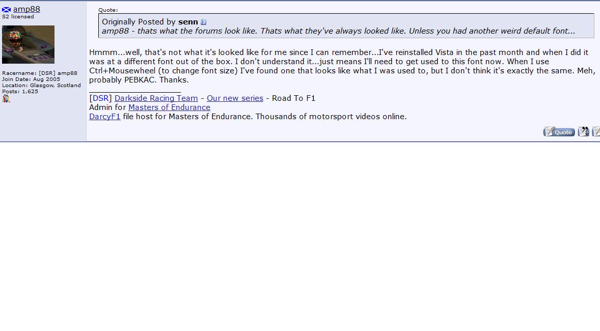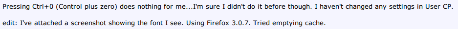 As Lateralus said the default font for this forum is Verdana so check in the Windows Control Panel -> Fonts if this font is installed and if the files are physically present in the \Windows\Fonts folder (4 files: Verdana.ttf, Verdanab.ttf, Verdanai.ttf, Verdanaz.ttf).