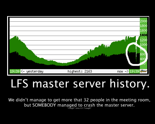 Quote from batteryy :lol, never tough you would be able to crash the master server by just this little amount of ppl arox spammed hardly, than crash.... funny though