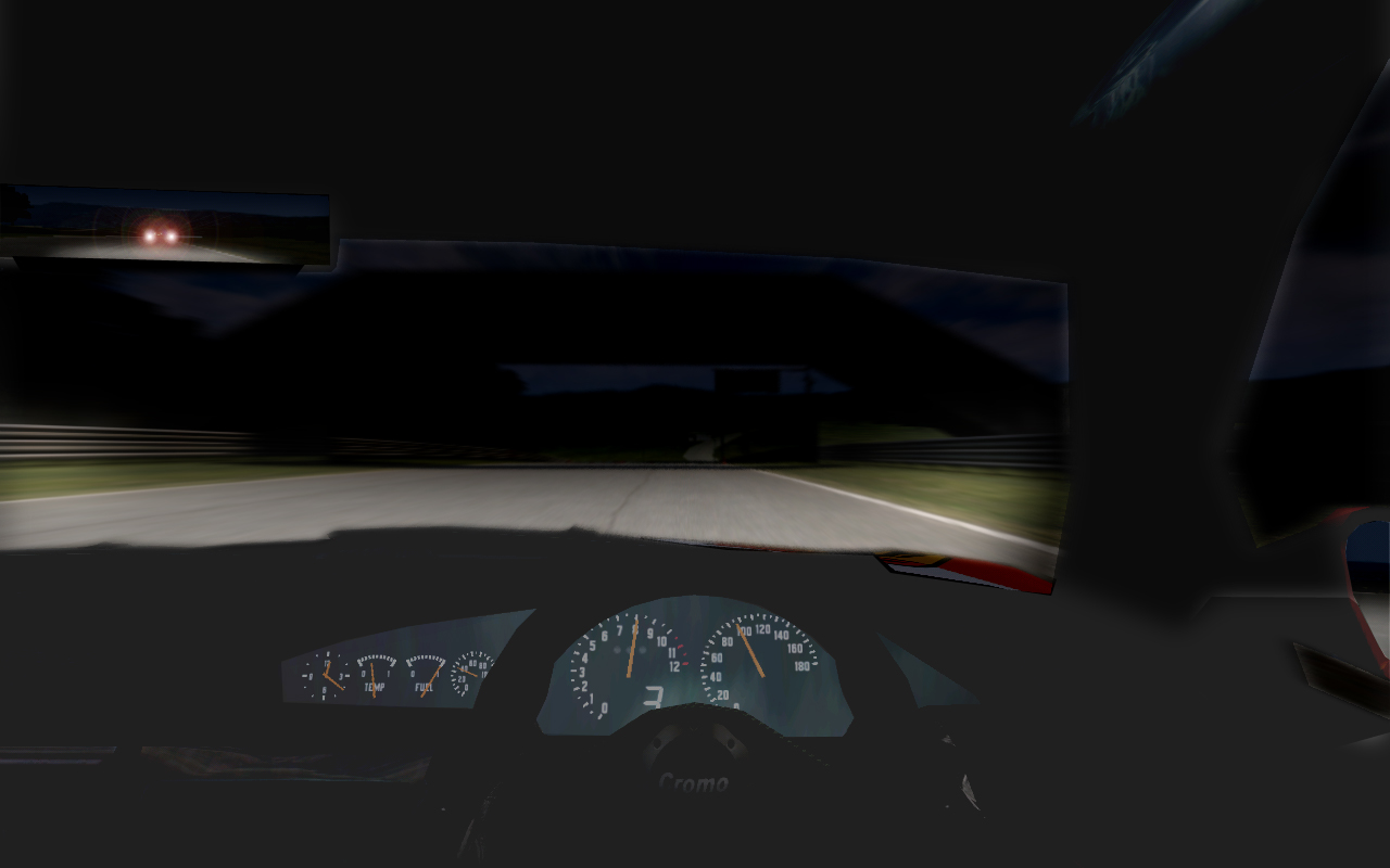 should have some lights on in that cockpit (and it should be black, not grey ), the mirror should be extremely bright from those headlights, maybe some lights somewhere out in the distance (WE does have lights you know)