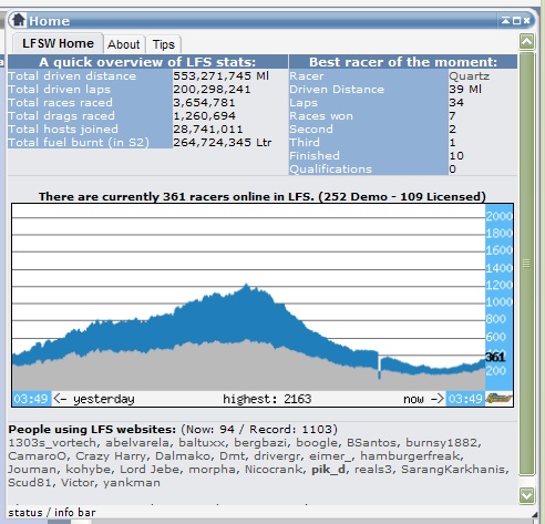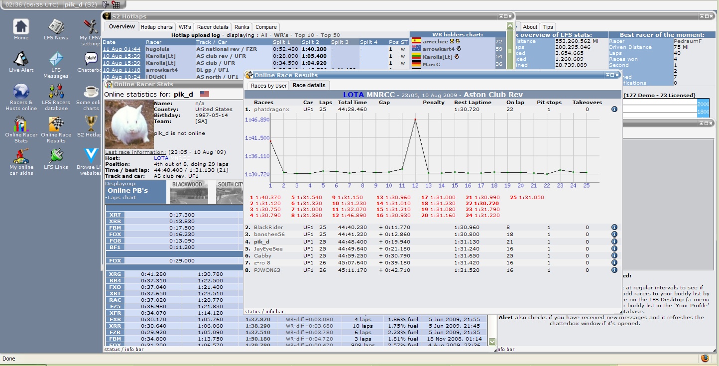 Hmm, This is from Tuesday August 11 02:23:47 (when phatdragonx started lap 3) to 02:30:23 (when pjwon63 completes his 6th lap which is the first one where LFSW picks up again) from looking at the Ctrl+Shift timestamps. Did the LFSW server have a hiccup during that time?
