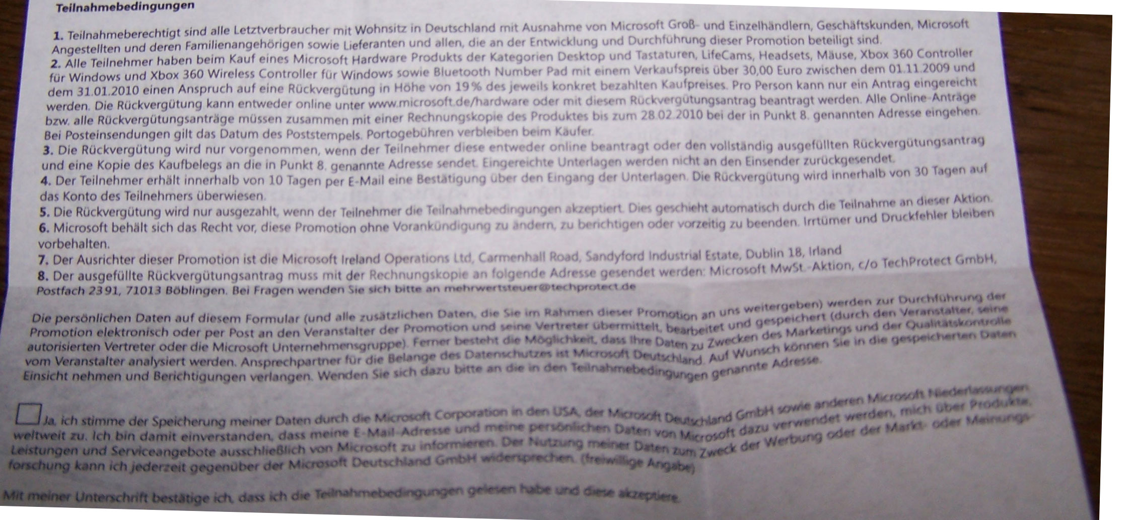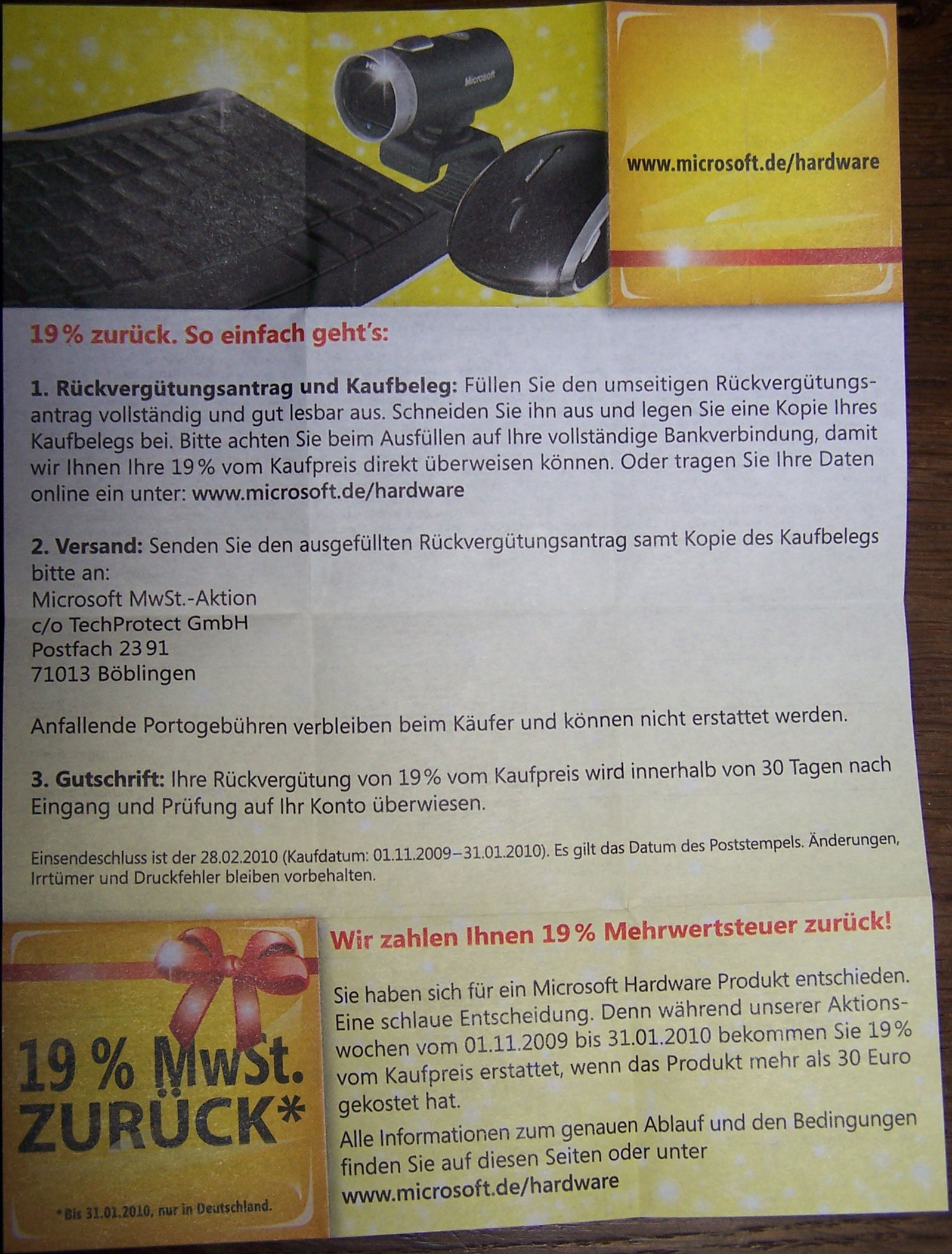 Just bought a new mouse from Microsoft, for some odd reason they've sent me one with a German little bit of paper stuck on the front. I'm *geussing* (mega uber geuss) that it's some sort of "claim your 19% rebate" thing, but my German goes as far as "ich mochte ein Wurste bitte" and not much further :P