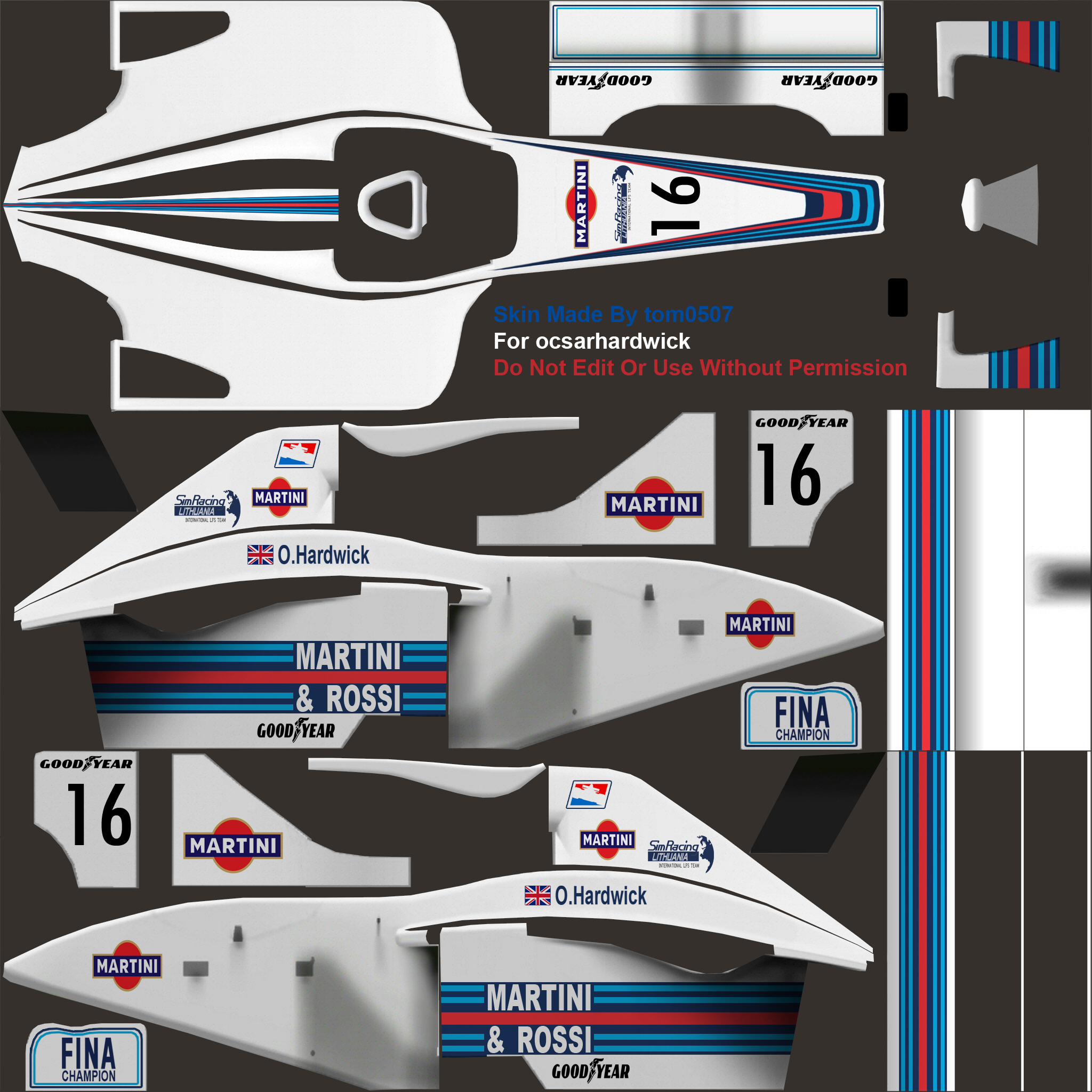 I was hoping that someone would make me a skin based on the Martini Brabham BT44 If anyone is willing to take this up I would be very grateful, oh, my number is 16 and if you could, add a SimRacig Lithuania Team logo onto the nose cone so as I dont get in trouble. if it looks better you may change the colour of the SRLT logo Also... I can manage the LFSCART logo stuffs should you not want to.