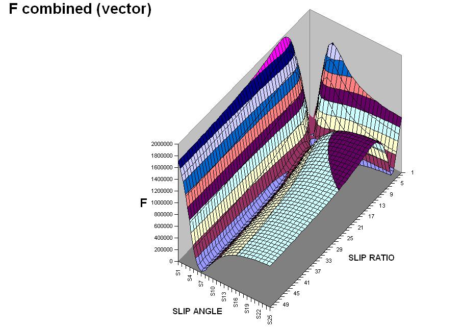Err... What is that for? Modulus of Fx - Fy * sqrt(2)? No wonder the maps are a bit goofy. If Fx and Fy are equal to or multiples of each other, then F=0. There isn't going to be a non-zero combination of slip angle and slip ratio that results in 0 force of course. See the valleys in the graphs that are at 0 force? That's probably why.