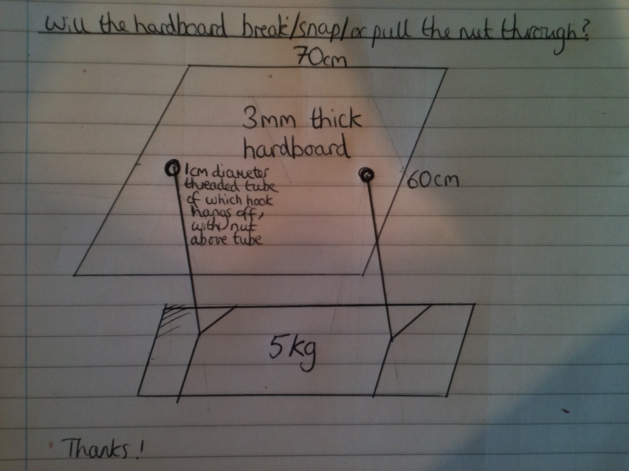 Basically, would a 3mm sheet of hardboard measuring 60cm x 70cm hold a mass of about 5kg which would hang of two chains. One chain hooks 10cmcm from the edge of one side of the hardboard, and the other chain hooks 10cm from the edge of the other side of the hardboard.