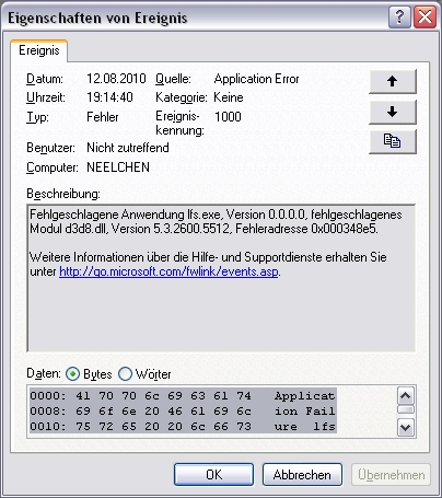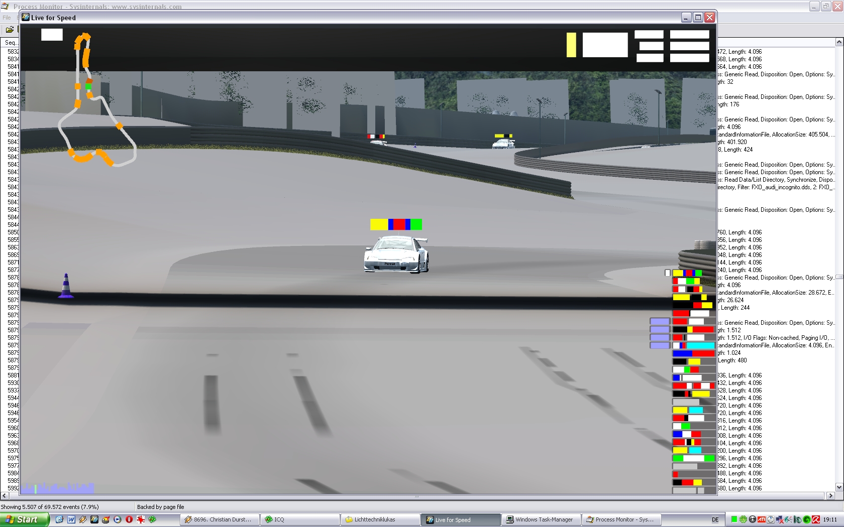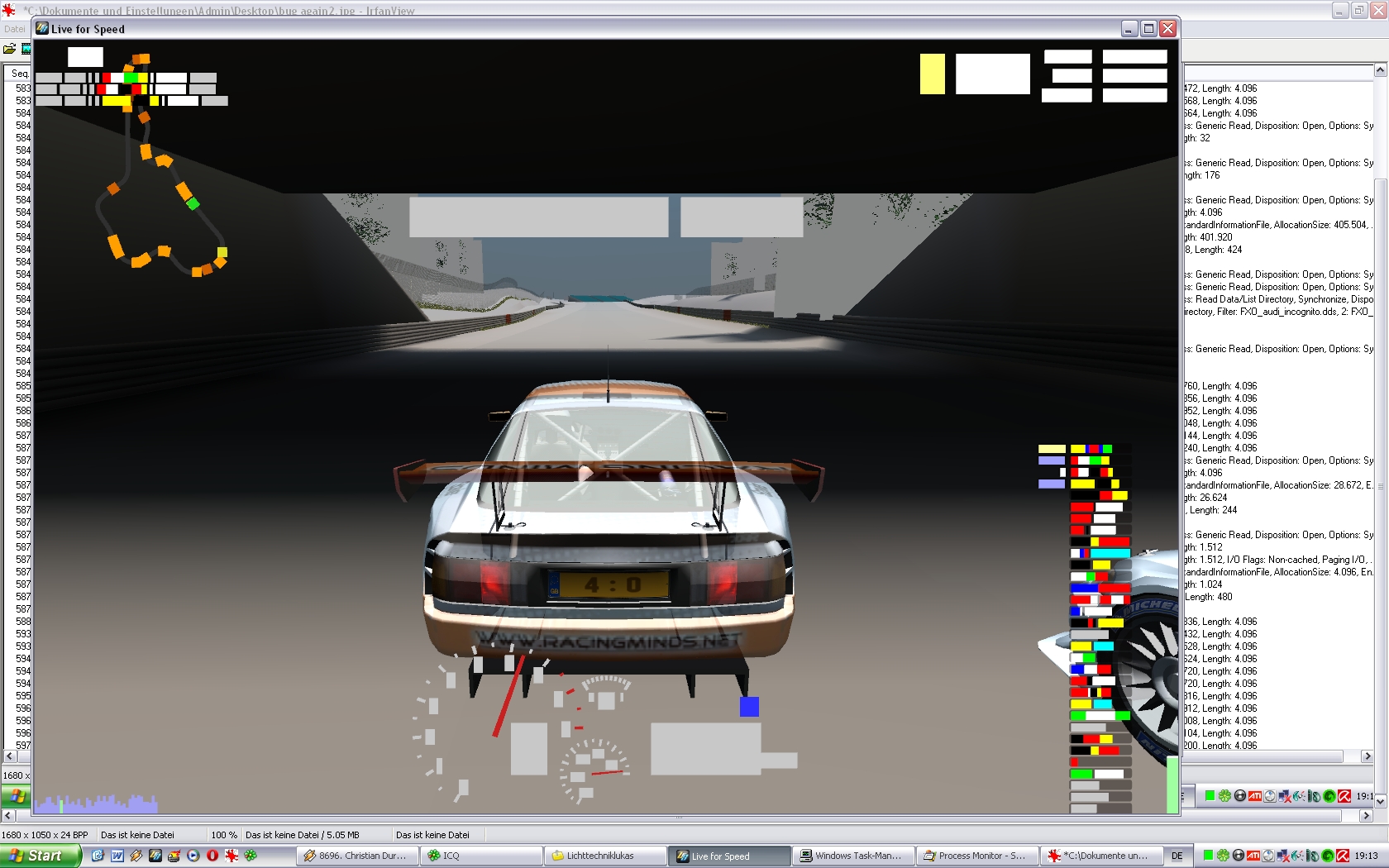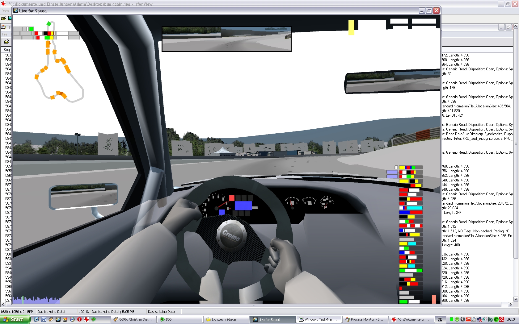 Frames drop to one digit levels, things you see on my attached screenshots happen, but LFS keeps going, I can happily switch between users and views, to pits etc. But even if I shut it down and restart the application LFS re-appaers in its glitchy state. Only cure is to restart the whole PC. Today it crashed when I shut it down, hence I got some more data, but dunno if anything is helpfull