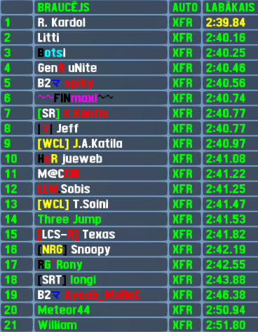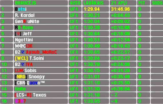 The WR holder of this combo Botsi proved his rights for being called fastest here - he was the only one to break 1:30 laptime mark in both qualifying and race,and despite losing lead early in race,he collected a clean sweep of win,pole position and fastest lap - 17th,15th and 13th accordingly,also reaching 32nd top5 finish,which is tied 2nd most in RTFR history. The one who tried to challenge Botsi was R.Kardol - the 3-time winner tried his best,but still had to concede and finish as runner up,17th top5 finish for him. Unite qualified just outside top5,but found his pace during the race and climbed up to 3rd position,increasing his top5 finish count to 13,Rony had to give up his qualifying's 3rd position and finish 4th for 79th top5 finish. And do we really need to say who was 5th yesterday? Jeff qualified and finished in 5th position,scoring his 11th top5 finish.