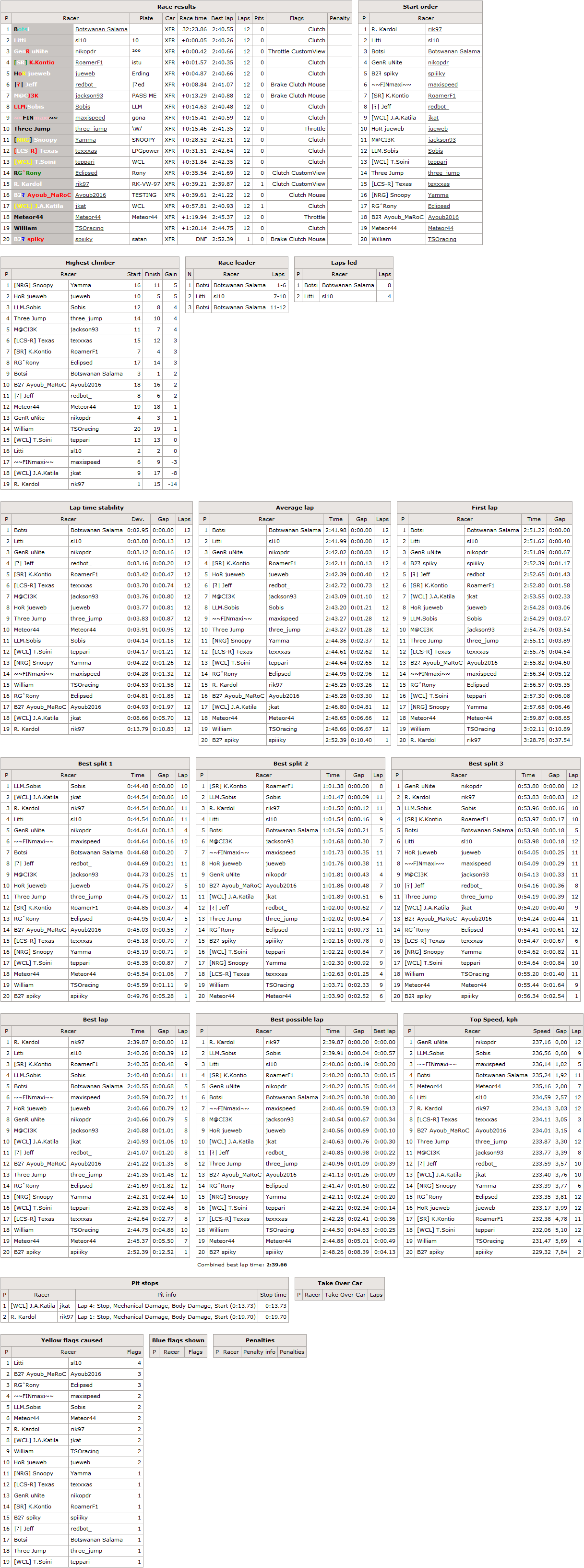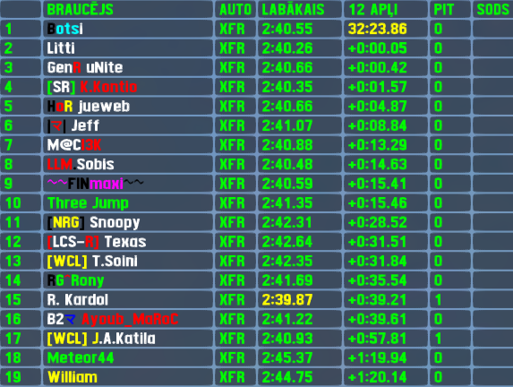 Let's start the recap with the driver able to set fastest laps in this combo - R.Kardol was the only one to beat 2:40 mark in both sessions and earned his 2nd pole position and 2nd fastest lap of the race. But 1st lap's final chicane was the spot where he lost any chances for good finishing order as you can see in video - just 15th place in results for him. So the battle for win was left to finns again - the best 2 of them were battling through 2nd half of the race while another 2 were following closely and waiting for chances. At the end Botsi regained the leading position in last hairpin and kept it over finish line to celebrate the anniversary 200th RTFR with 16th race win,which puts him now on top of the all time success rank. Botsi also scored his 31st top5 finish - he's closing in on 2nd best in this table Falcon,who has 32 top5 finishes (which coincidentally is also his racing number). Litti is known for winning a lot of races whereever he races,but hasn't had much success in RTFR - 2nd place yesterday,which is just 3rd top5 finish for him from 10 race starts. Winner of last race and rating/2019 standings leader Unite was in best seat to watch the battle for win and few tries to get involved didn't paid any dividends - 3rd place for him,12th top5 finish,10th of those in row. First time participant K.Kontio was the 4th finn in the leading mix - 1.5s off leader statistically normally would be 2nd place,but just 4th yesterday. Best of the rest was another 1st time participant Jueweb,who finished 5th,making 5 positions progress during the race.