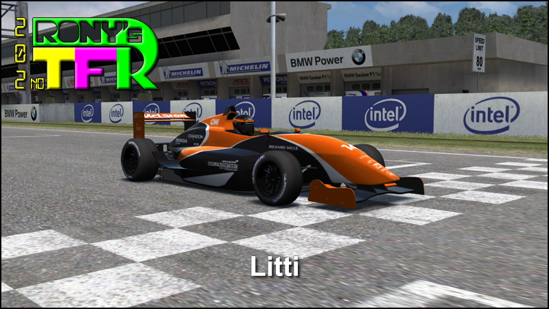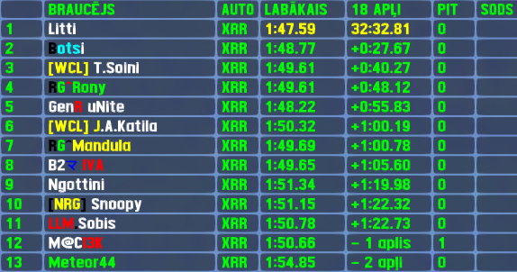 Allthough there was no real action up front - Litti pulled away from the competition right from green lights and dominated every meter of the 100 kilometer race. He added to his stats 3rd win,4th pole position,5th fastest lap of the race,5th top5 finish and stretched the finnish domination to 8 wins in row (2nd effort from him in this streak). There was a race for 2nd place in early 1/3 of the race,but Botsi's chase target just retired and gave him free ride to 2nd place,35th top5 finish for RTFR all-time most successful driver. "Mr. Steady" T.Soini drove a very steady race in 3rd position,which is repeated best finish for him,17th top5 finish in his account. 4th was the only "outsider" top6 in this finnish dominated race - Rony finished 4th,extending his top5 count to 80,Unite finished 5th despite trying his XRR as rallycross car on run-off area of turn 2 of 1st lap,his chase effort was good enough to keep the top5 streak alive - 12th top5 finish in 12 races this year,16 overall.