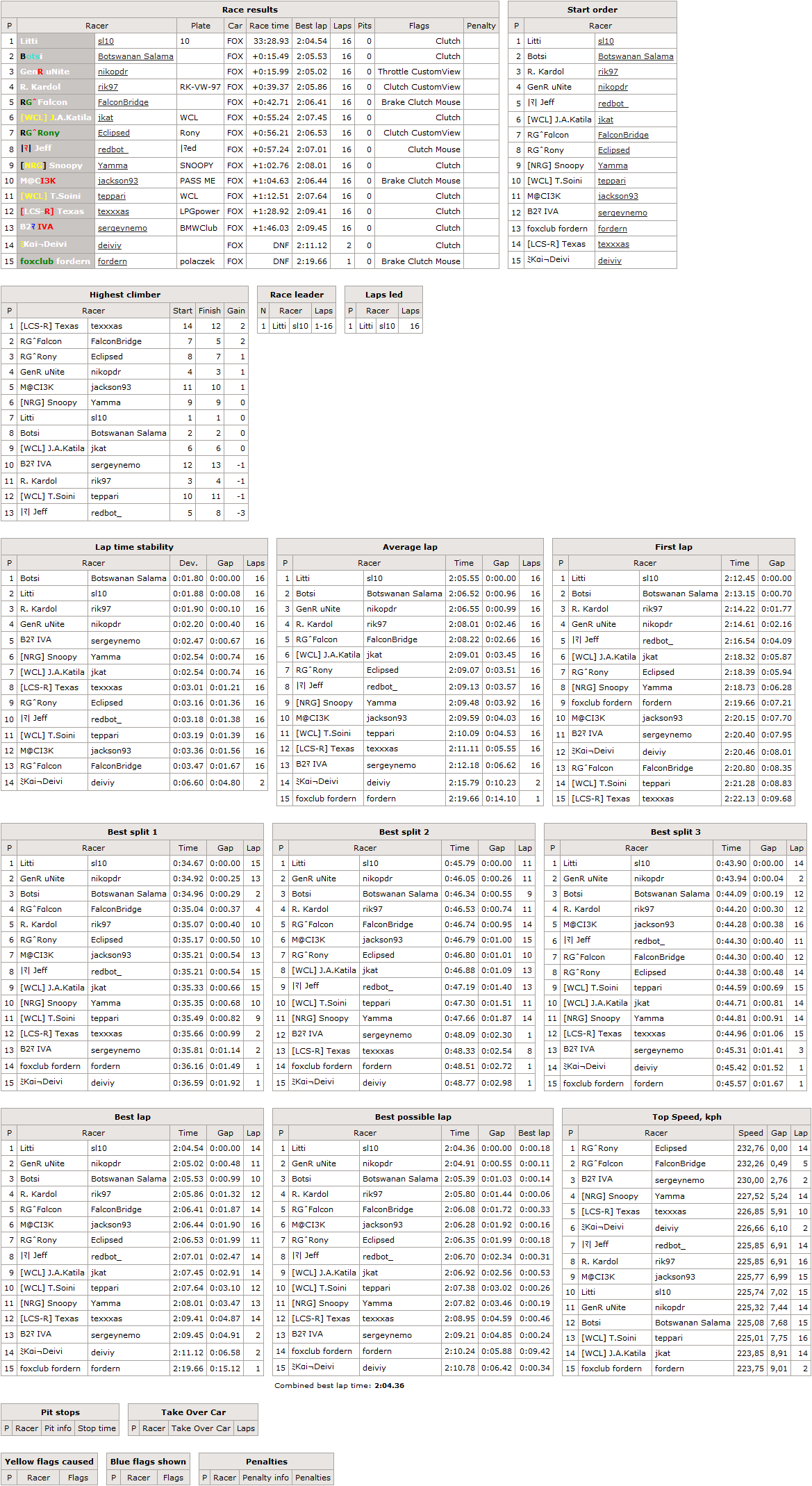 A driver known for his pace with FOX and FO8 joined this and proved that he can race also all-wheel-drive coupe - Litti was the fastest in pre-event practice,set the best time in qualifying (his 3rd),set the fastest lap in race (his 4th) and led from green lights until lap 20,where he retired just like that. Finmaxi,who joined RTFR for the 2nd time,took over the lead after Litti's retirement and never gave it up,lapping most of the field on his way. The finn writes himself into RTFR history books as the 69th different race winner,first new one since 196th RTFR in february,he also extended finnish dominance with 7th win in row for Finland. With quarter-minute gap to leader in 2nd place was R.Kardol,scoring his 19th top5 finish,3rd was Botsi,who took his 34th top5 finish - that puts him into sole 2nd place in most top5 finishes chart. J.A.Katila was the last driver on the lead lap,his 4th place finish is his 22nd entry in top5 finish list and top5 was closed by another finn - the rating and 2019 standings leader Unite. He kept his top5 finishing rate to 100% this year - 11th out of 11 races,15th total.