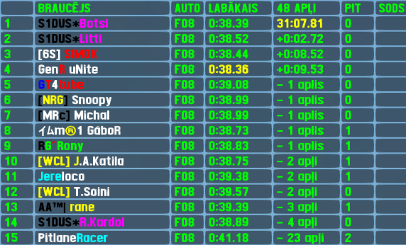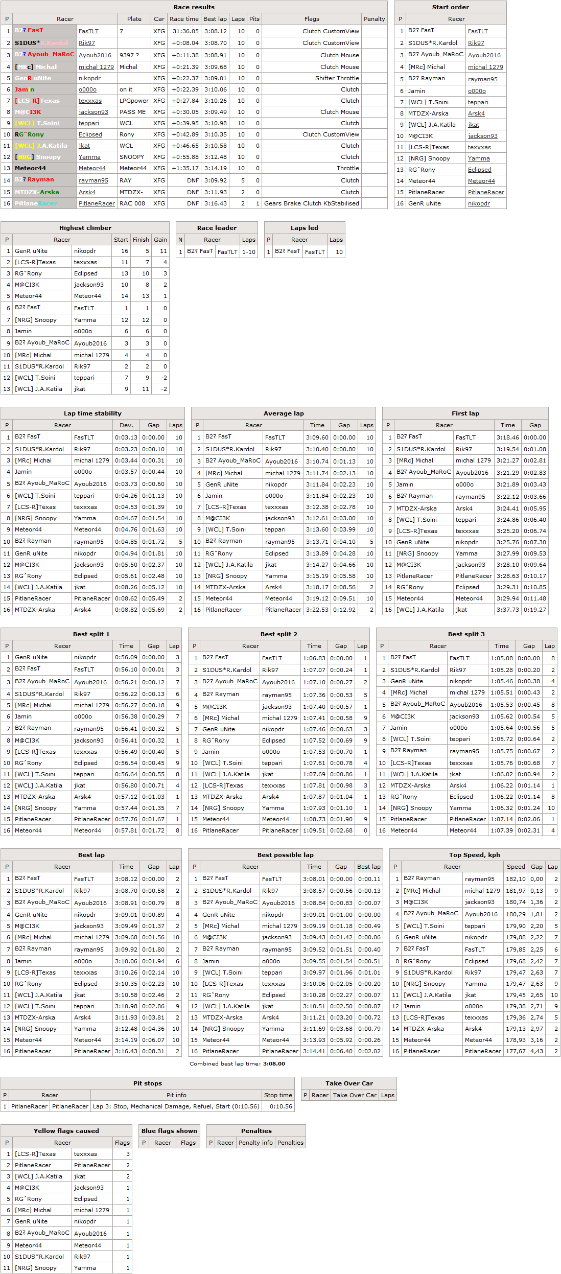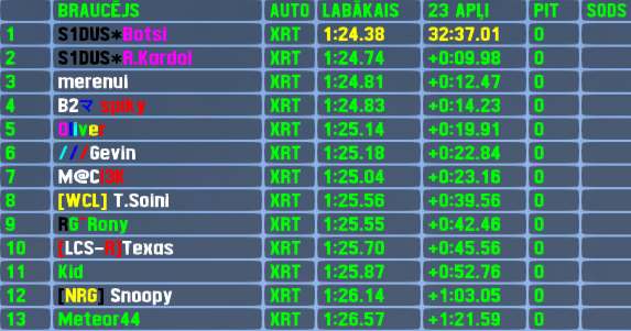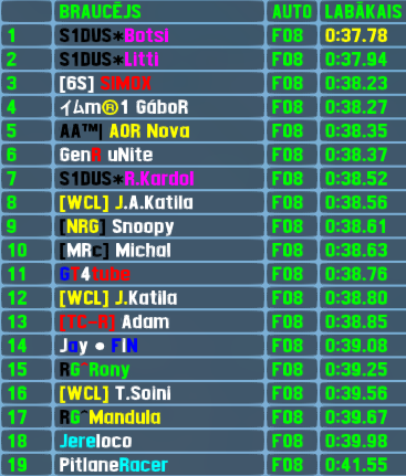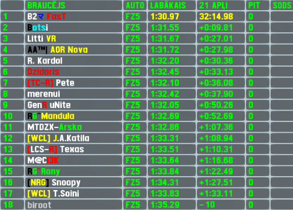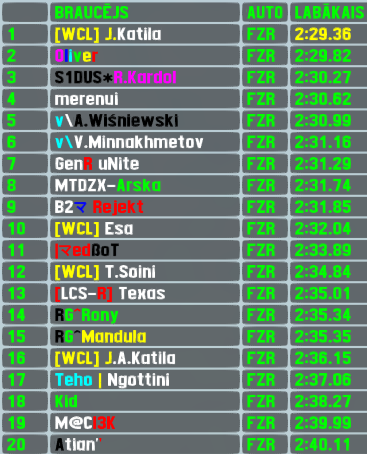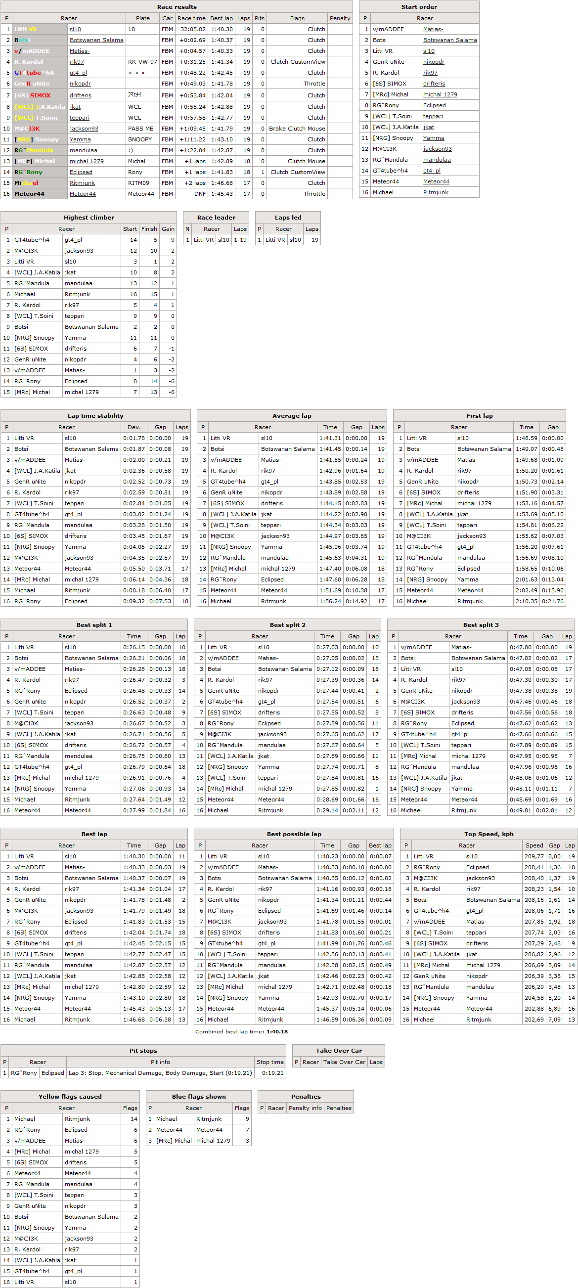 The 4-time winner Litti (while using a VR device?) started the race from 3rd grid position and after 1st chicane used the fight between both front row starters for his advantage and outbraked both in the 1st actual turn - he never gave up the lead for remaining 76 kilometers of race distance and joined a bit more exclusive 5-time winners club. While running away from competition,he also set the fastest lap of the race - his 7th,while he also finished in top5 for the 7th time. Botsi was the 2nd fastest in qualifying and kept this position also after early position switchings,but his chase for lead never succeded - 2nd place finish,which is 38th top5 entry for him. Maddee set the fastest lap in qualifying and scored his 2nd pole position,unlike last time he did that,this time he tried to convert in into win - he started an RTFR race for 2nd time and completed one for the first time with 3rd place finish. Ironically the driver who broke finnish winning streak was the fastest non-finnish driver also yesterday - R.Kardol was best of the rest and finished 4th,scoring his 21st top5 finish,while first time participant GT4tube closed the top5.