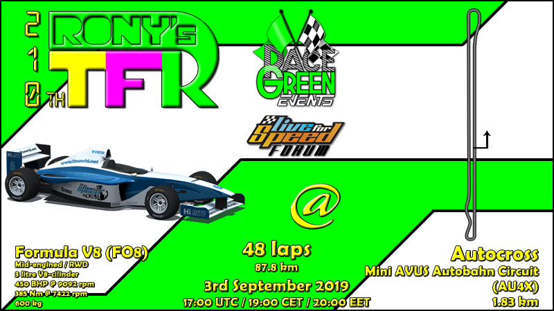 Next week it will be time for the longer RTFR version XL,where the fastest car of LFS will make it's debuth in the event - BF1 will be raced in Kyoto National course,used in reversed direction,full details tomorrow in the according thread. A week after that again the normal RTFR will return with one of the street legal cars for racing,info about that as always in the weekend before that.