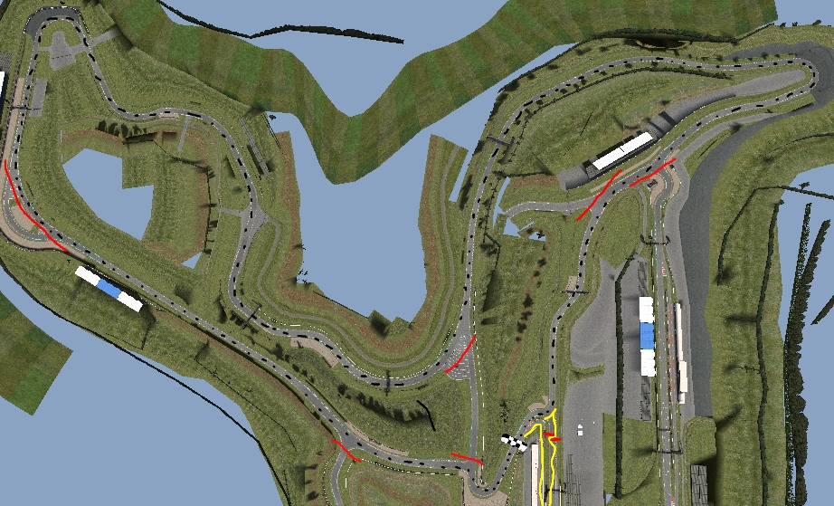GTR's should lap it in just under 2 min. There is a special track enterance from the starting grid so it may be used pretty nicely for leagues, and the pit road is not exactly set up in a traditional fashion, but it may be used as well. Be careful on pit exit and race start as your speed will be quicker than on a typical lap.