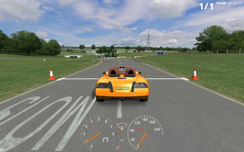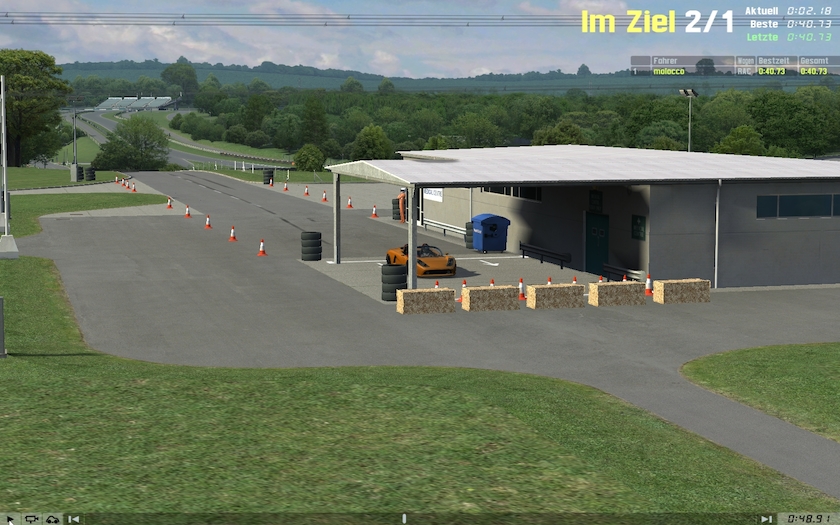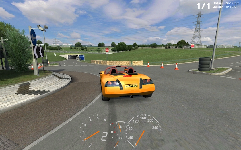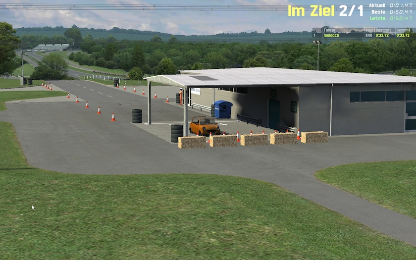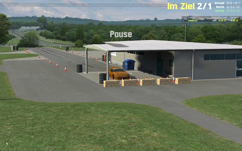 doesn´t seem that hard, is it? just try and you see that there is indeed a challenge here. first there are some „easy“ corners, but to take maximum momentum thru them is not that easy as you can not touch any of the cones or haybales.