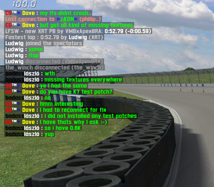 Some people experienced a crashed LFS. I didn't, I was minimized.. But when I switched back I was missing almost all textures, could see 'through the ground' most was gray... Should have taken a screenshot but I thought it was me.