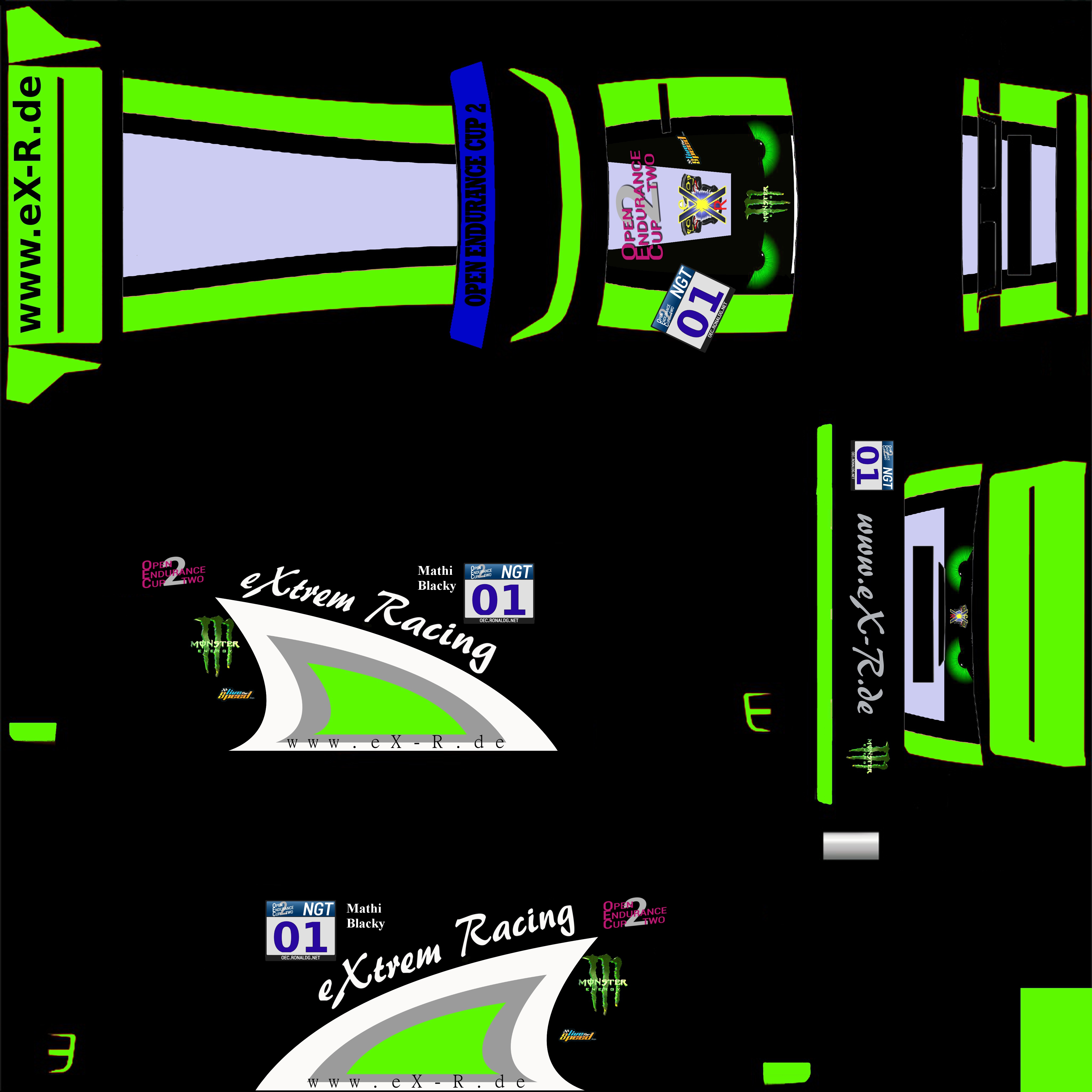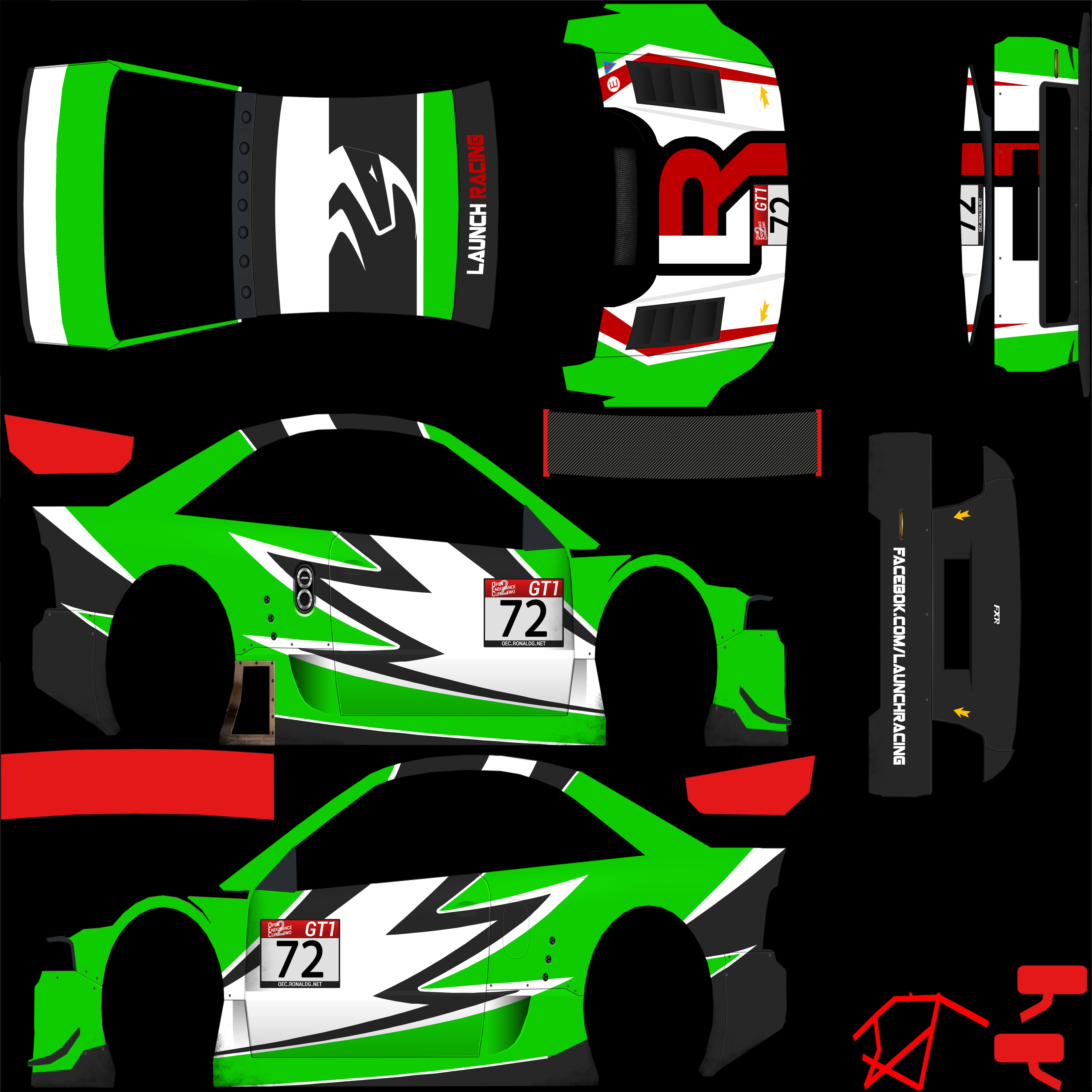 To tell GT1 from GT2 cars, GT1 cars shall paint the complete underside of their rearwings and both car's mirrors in red (#e41819), GT2 cars shall paint these elements in green (#009635). NGT cars have no further requirements.