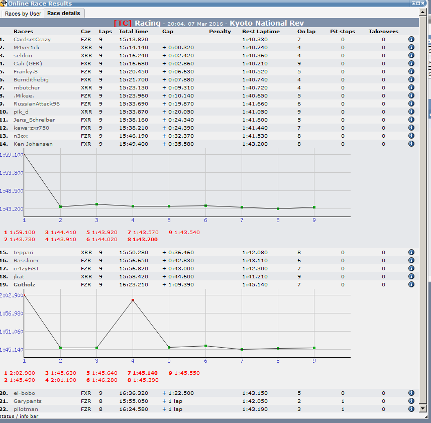 Anyways it would also open up the possibility for league based statistics (For example the Elo System I proposed for the overhaul of the website and is working well for the CityLiga.*cough*), but it would definately create a possibility to get all relevant information of league racing to one place.