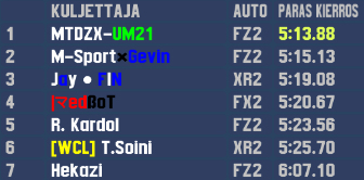 3rd place goes to UM21, who was OP driving 1LX car. 1 win and also 1 miserable DNF was enough high to reach podium and managed to beat T. Soini by 38.51 seconds. Both mentioned drivers won once and retired once as well, but UM21 was faster. That turns out, he gains the "Bronze Medal" and Soini ( LFSW: teppari ) is left in 4th position.