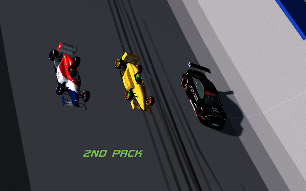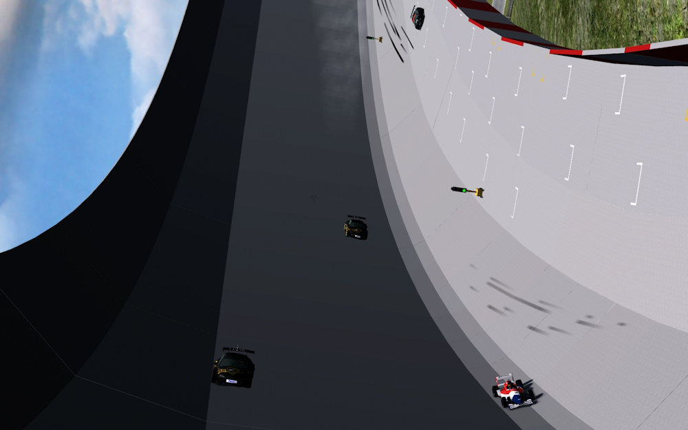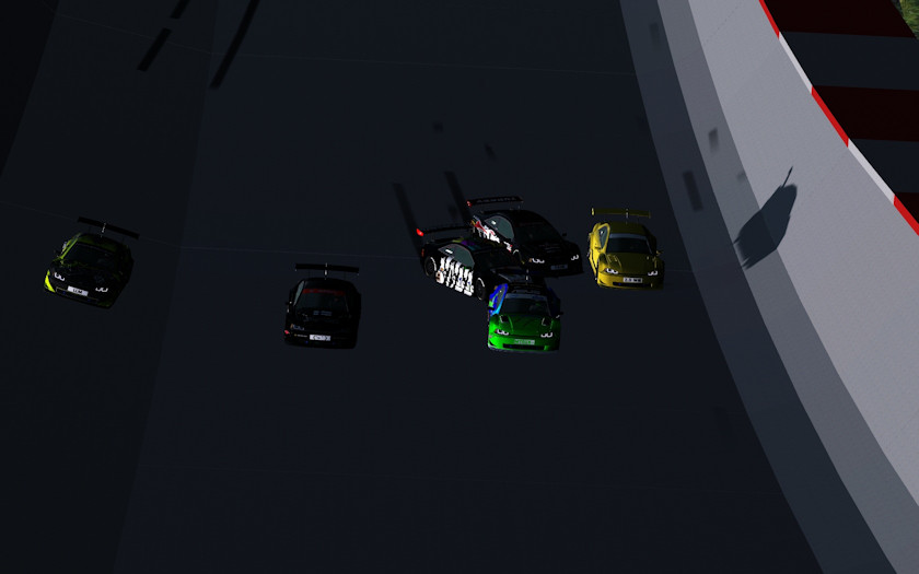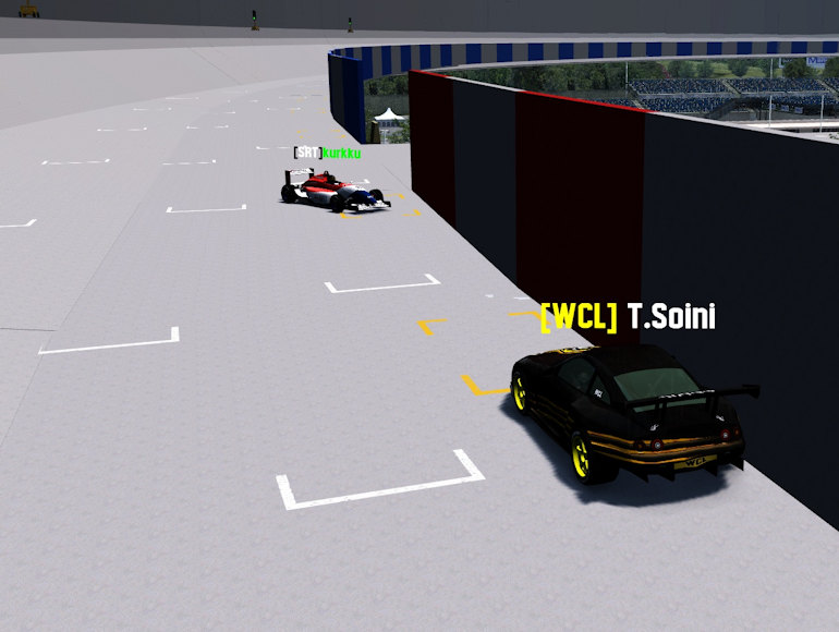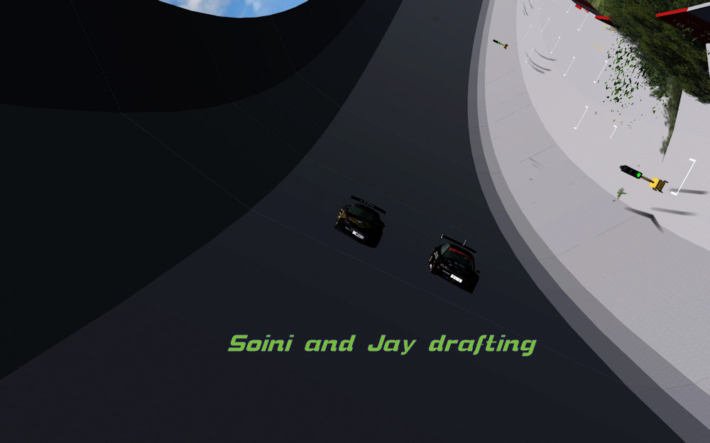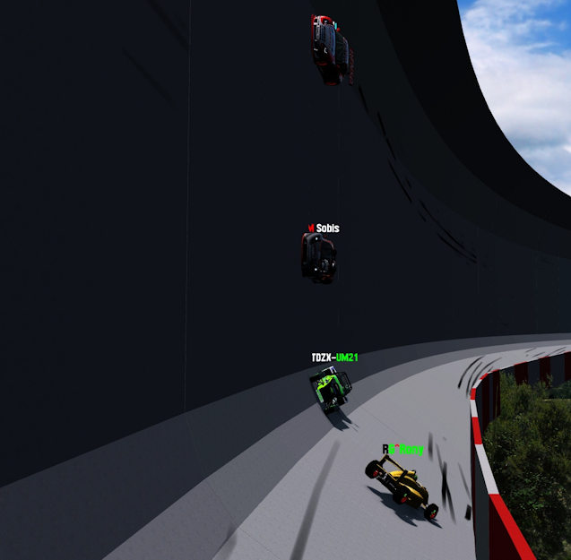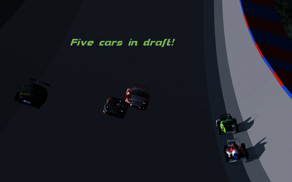 Top speed was much slower than expected, but only because not enough racers to gather side drafting, which multiplies the amount of actual draft the more people it involves. This abuse is however legit as it does not involve any hacks or tools and is possible to do in vanilla LFS.Exe. This side draft is technically possible to have several racers driving on each other, and because track had 90 degree banking, technically they were on each other. This works in any solution, as long as there is driver under or on other racer, it will make an effect of infinite draft. The more people it gathers, the stronger it is.
