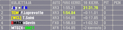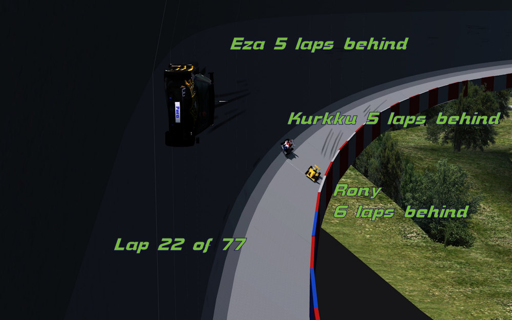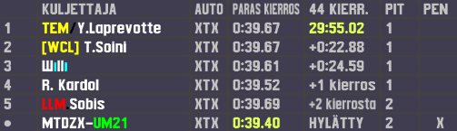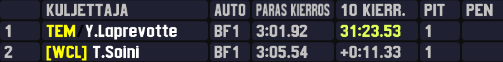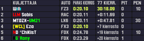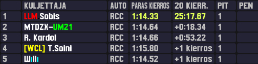 Statistics in somewhat 50% of the race completed. ( Atm T.Soini is for mandatory pitstop, which is not seen in picture, being overtaken by RedBot at this picture, driving on 5th position. )