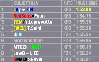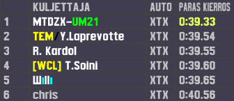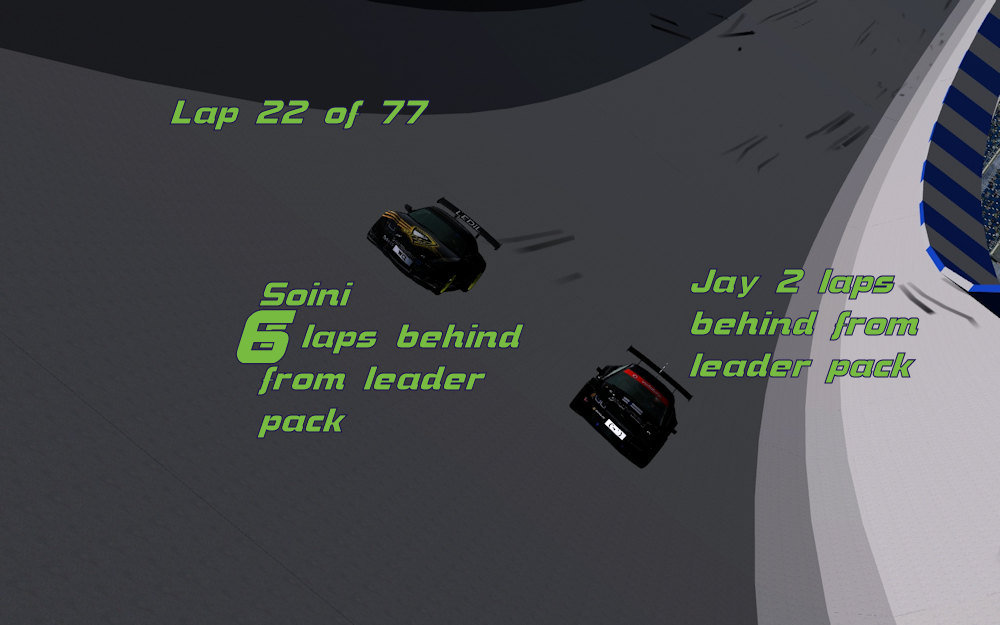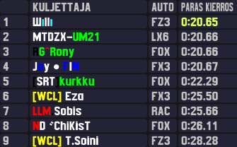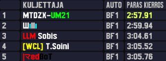 2nd place is taken by Jay from Finland! Jay ( LFSW: jh89 ) did led 34/99 laps and definitely was on good pace for victory. Unfortunately the aimed target slipped away by Sobis's brilliant slingshot move and crossed the line just before Jay. Still, fastest lap along with Arska. 2nd Fastest Lap is taken and now first one which receives one extra point!