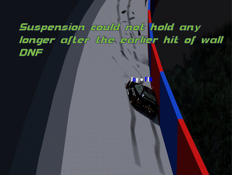 Outcome is drastic! Mr. Flat Out! is out of the race! Suspension did not hold any longer... only 2 corners left. As could not steer at all, DNF is the only solution! Very unexpected!