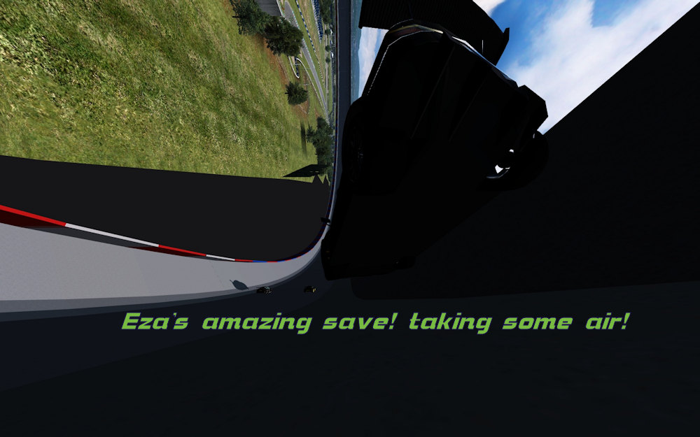 As UM21 was far behind due suspension problems. He is getting lapped by Jay. However, attempt to gain some draft will cause some dramatic moment... an epic save! Cold tires are cold, no grip in other words!
