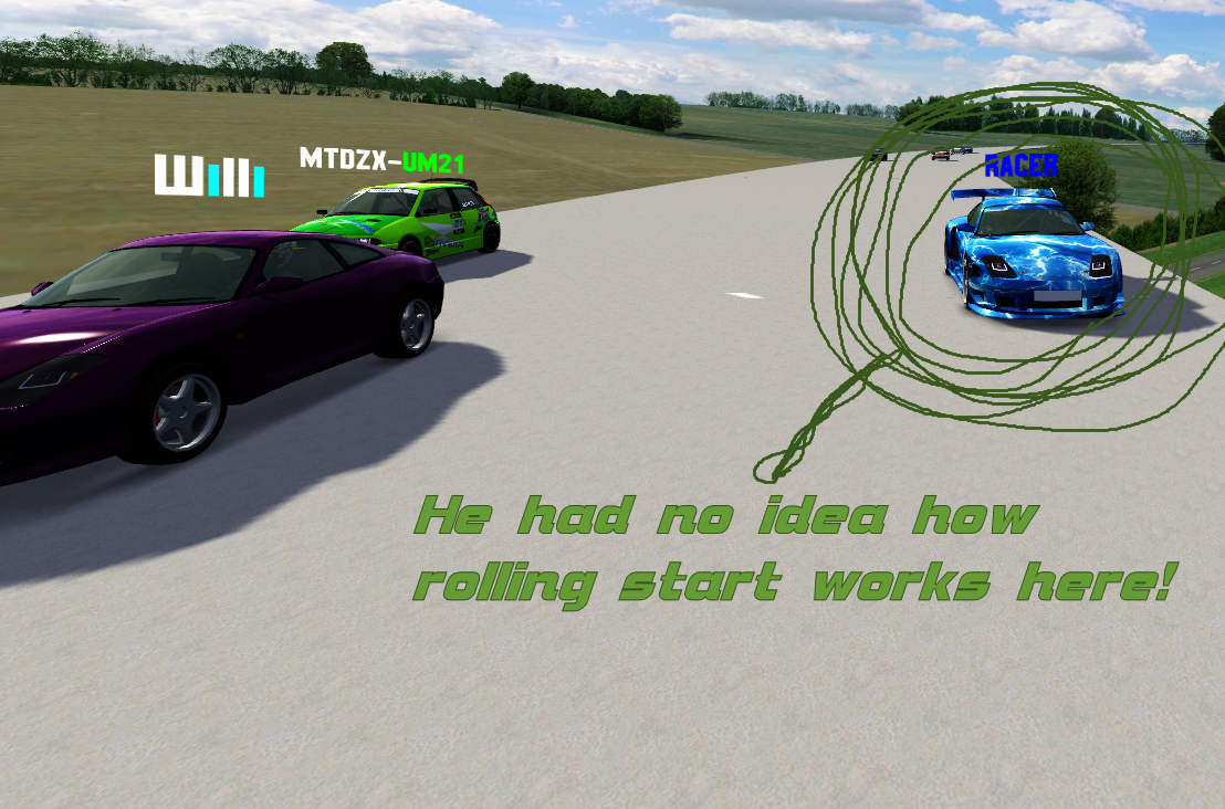 Very first one, this guy is the one who gets suspension. RACER ( LFSW: Octosquad ) failed big time to understand some certain methods of rolling start. He did jump to the several positions higher than ordered, eventually did drop off the track. He also did go to pits and coming back to race, as going to garage or spectating and coming back to track is strongly forbidden. Blocker was not activated, but that does not mean to break some rules. He eventually DNF by simply giving up.